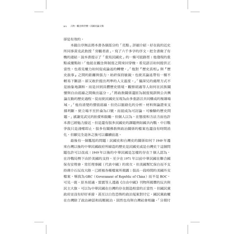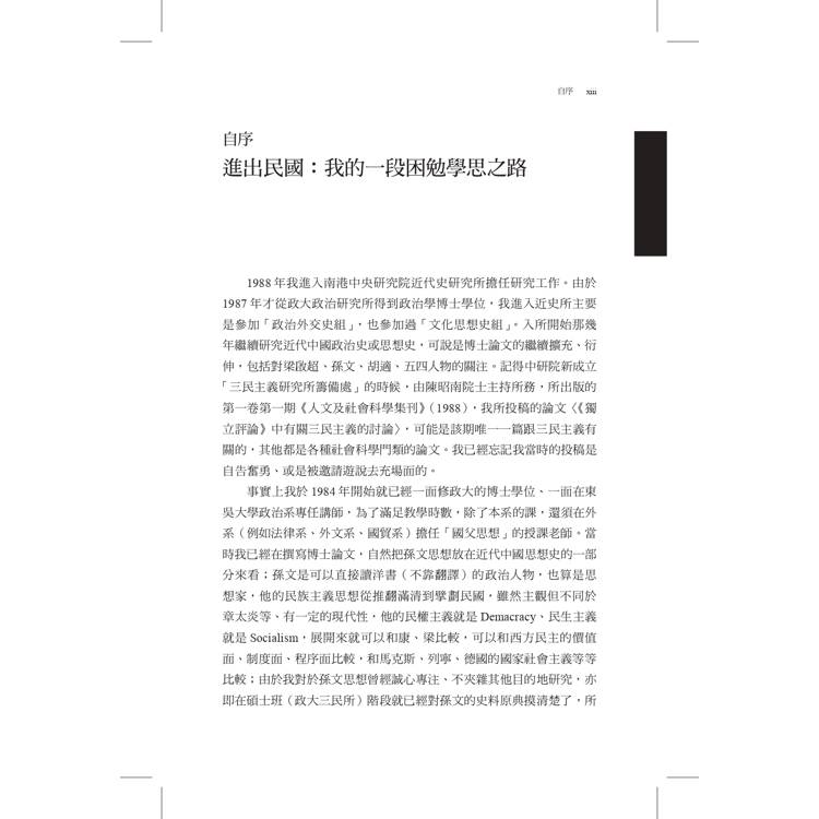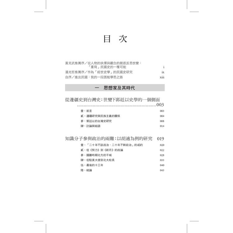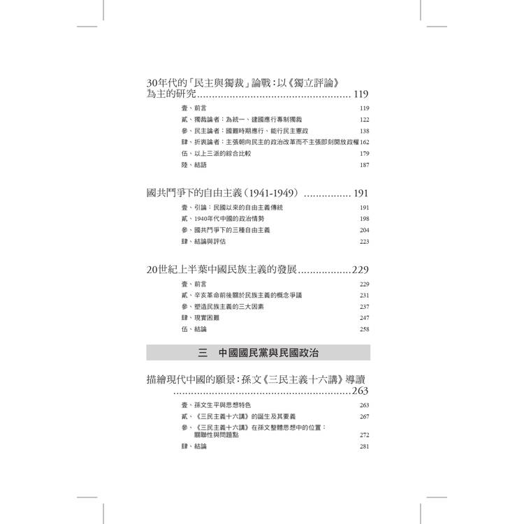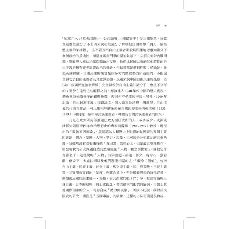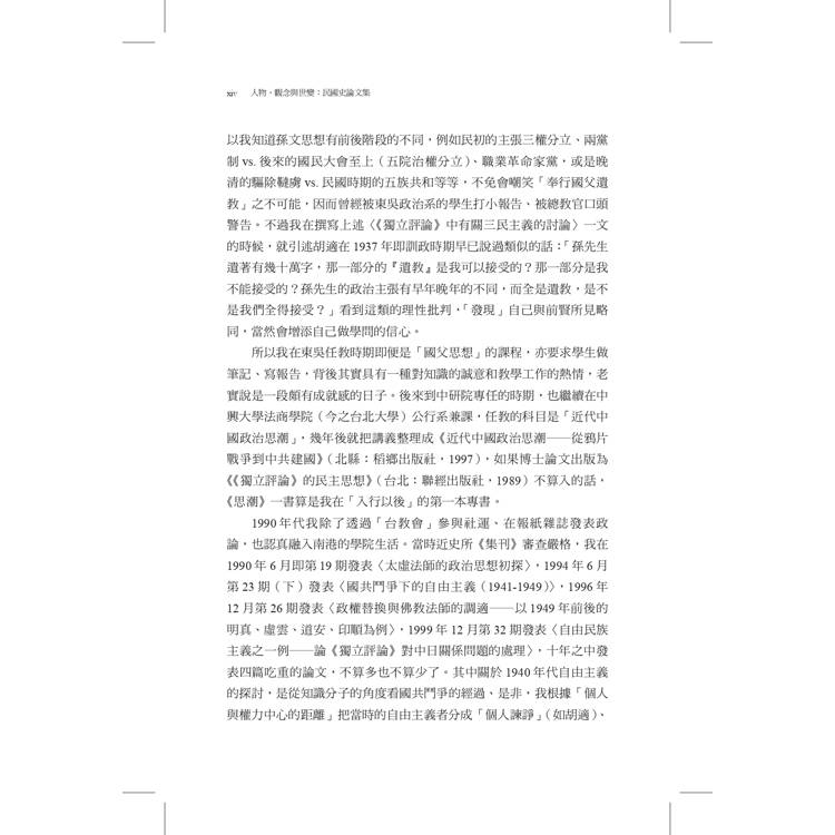 作者從1988年進入中研院近史所服務,迄2019年退休同時轉任國史館館長,三十一年在南港的學術生涯,前半段主要是做民國史研究,先是從博士論文《《獨立評論》的民主思想》衍伸出來,包括自由主義、民族主義、三民主義,歷史人物如梁啟超、胡適、蔣介石等;其次因與近史所前輩、同儕互動,對於辛亥革命、中日戰爭、國共內戰問題也會有書寫和回應,並基於個人興趣發表若干民國佛教史的論文。後半段的學術生涯雖轉向台灣二二八事件、白色恐怖案件、台獨運動史的研究,但1949年後國民黨政權在台灣統治半個世紀,它和台灣的命運交疊。所以,民國史和戰後台灣史的研究,實有著難分難解的一面。