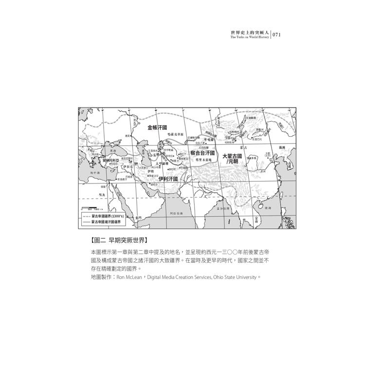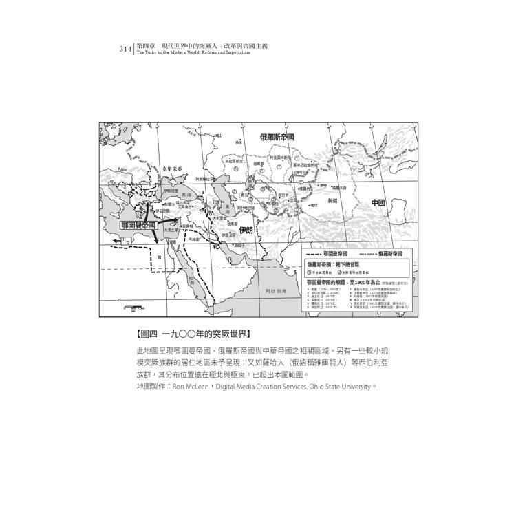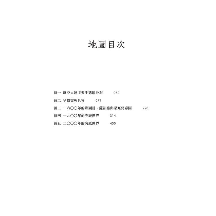 五、收入「歐亞大陸主要生態區分布」、「早期突厥世界」、「1600年的鄂圖曼、薩法維與蒙兀兒帝國」、「1900年的突厥世界」、「2000年的突厥世界」五幅地圖,便利讀者對照文字敘述閱讀。