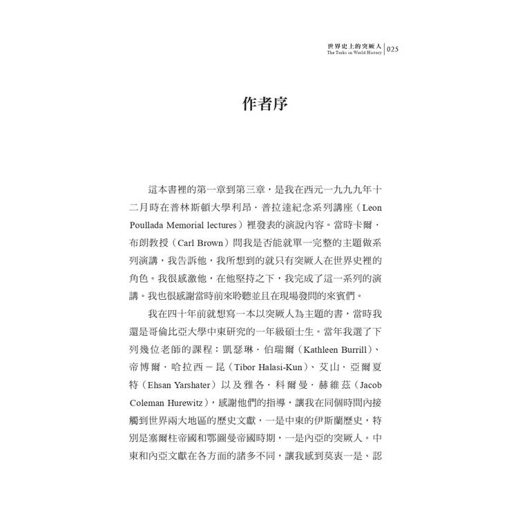 本書就是要找出突厥人歷史當中那些長期不變的連續性以及各種獨特的圖案設計。若要全面探討突厥人在世界歷史中的發展,依照時間先後順序,就一定先想到在信奉伊斯蘭之前的突厥人以及他們的前身(整個十一世紀);再來就是突厥人與蒙古人進入到了伊斯蘭世界(從十一世紀到十四世紀),在這段期間內,突厥人與蒙古人共享了許多事物;接著就是,亞洲本土大帝國建構的最後全盛時期(從十四世紀到十八世紀);最後,突厥人來到了現代。這是一趟在時間裡進行的旅程,文明之間有時會產生衝突,其他時候又彼此融合,脫胎換骨、煥然一新。如我們所見,突厥人的歷史裡不僅有長期不變的連續性,同時也有徹頭徹尾的大變革,兩者都十分令人讚嘆。在所有的變革當中有兩項特別突出,也特別重要:首先是,突厥人進入了伊斯蘭世界,其次是,他們進入了現代。(未完)