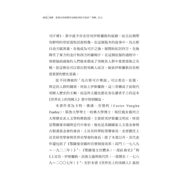 ►「芬德利這部作品是近年來突厥與土耳其研究中最引人矚目的成就之一,也是該領域廣受歡迎且迫切需要的貢獻。從突厥遊牧時期,到伊斯蘭帝國的輝煌,再到與西方思想的交會,作者以單卷易讀的形式巧妙呈現,並附有特別繪製的地圖。」――《美國歷史評論》(American Historical Review)