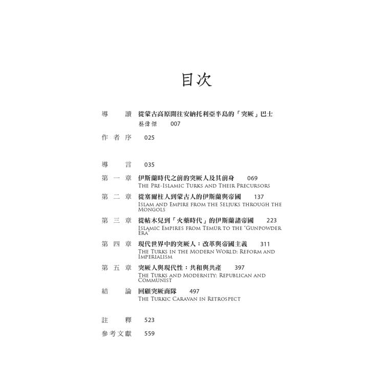 本書正文共分為五章,主要是按照時間順序,分別以帝國構建、伊斯蘭教與現代性等重要歷史因素,來探討突厥人在世界史上的地位。