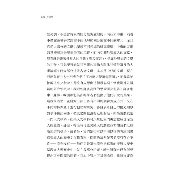 一、本書為《世界史上的中亞》之姊妹作,是一部導論性的作品。相較於《世界史上的中亞》以「地域」(中亞)為論述中心,本書則以「族群」(突厥)為敘事主體,兩書縱橫交錯,更能得窺內陸歐亞的歷史全貌。