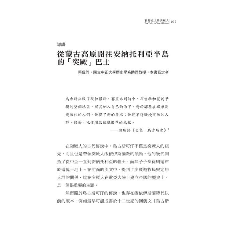 ►「一部適時、豐富且易讀的著作,梳理了突厥民族認同的時空演變,以及從草原到帝國,再到民族國家的歷史進程。」――《歷史》(History)
