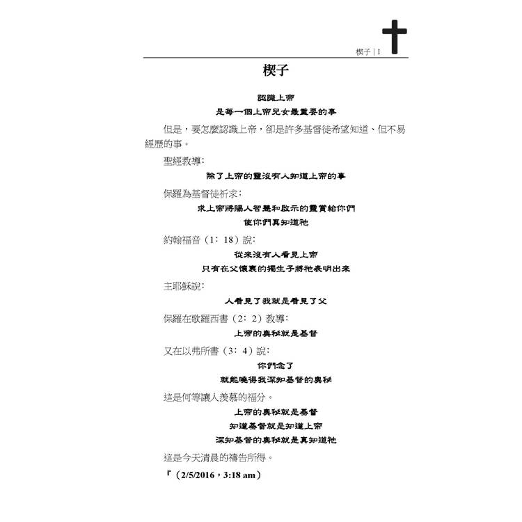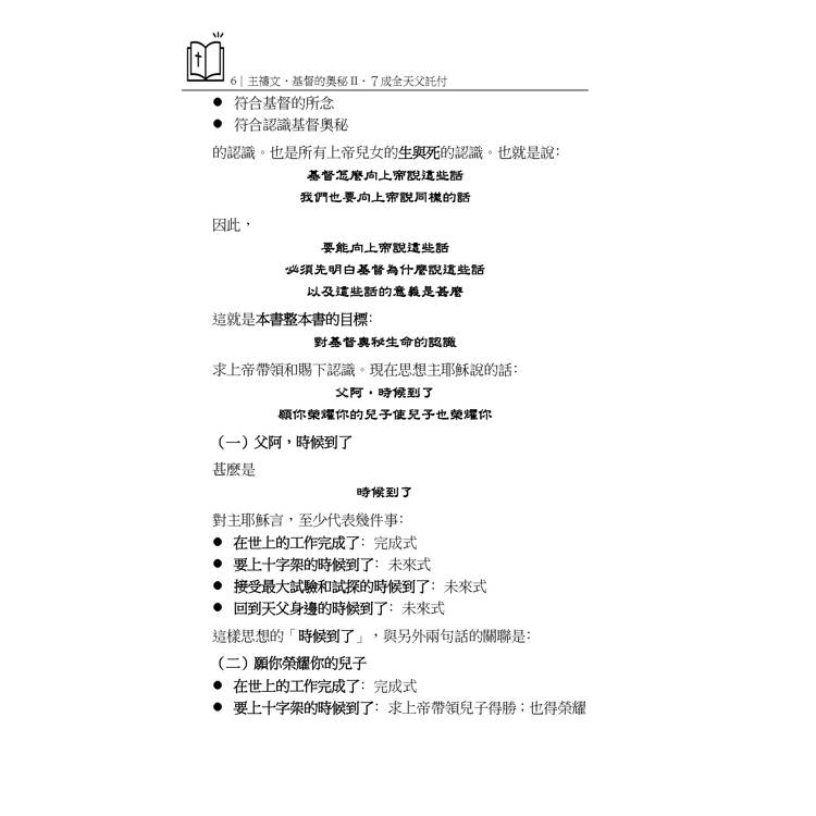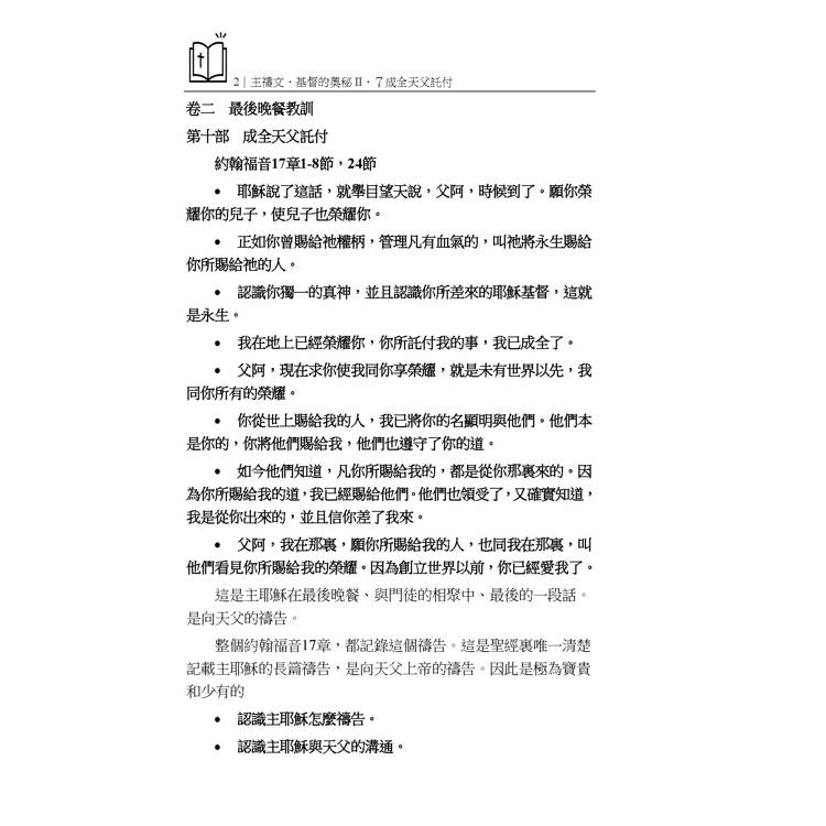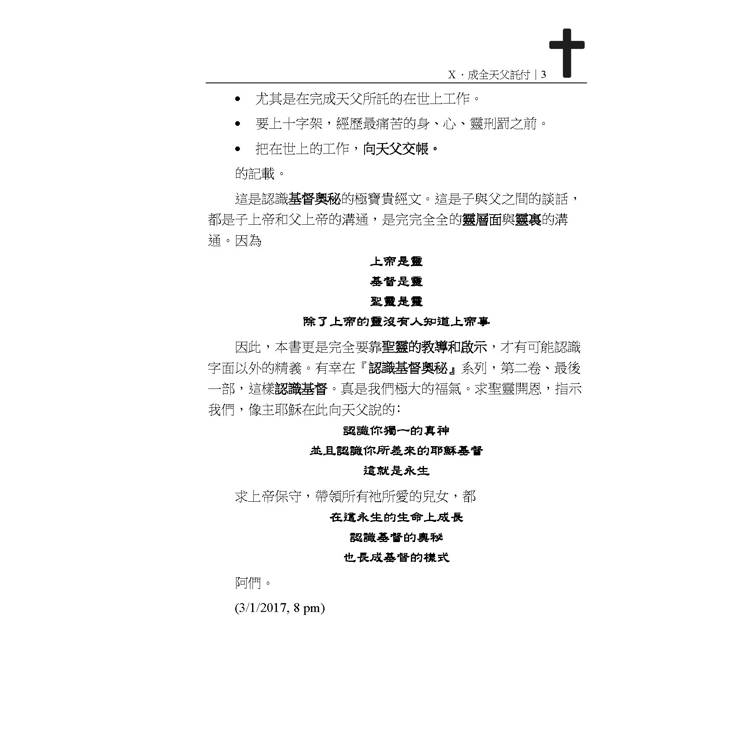 因此,本書更是完全要靠聖靈的教導和啟示,才有可能認識字面以外的精義。有幸在『認識基督奧秘』系列,第二卷、最後一部,這樣認識基督。真是我們極大的福氣。求聖靈開恩,指示我們,像主耶穌在此向天父說的﹕