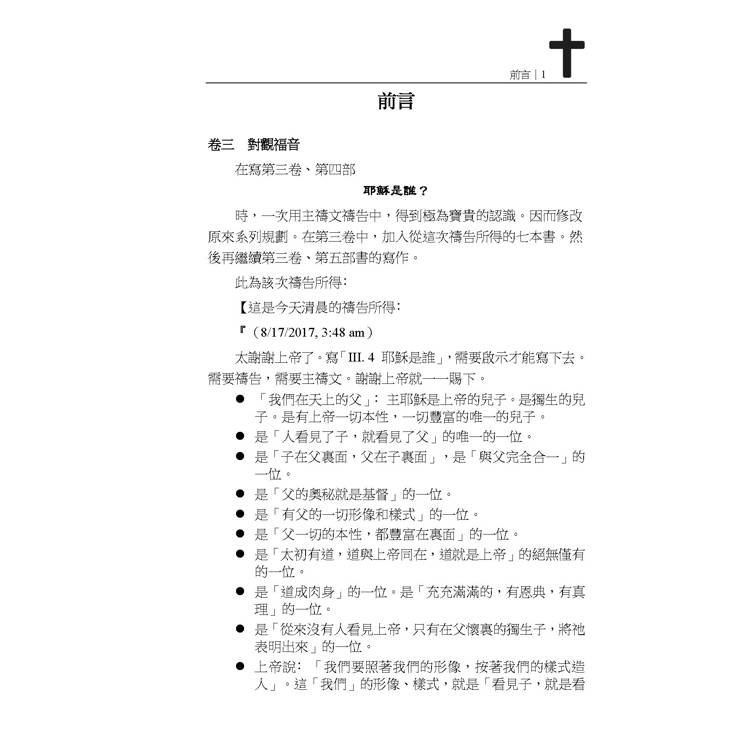 感謝聖靈,一再藉帶領我禱告,繼續認識上帝,認識基督,也認識聖經。求聖靈賜下智慧和啟示,帶我忠心。讓上帝旨意完全行在我身上、和所有看到這些書的人身上。阿們。』
