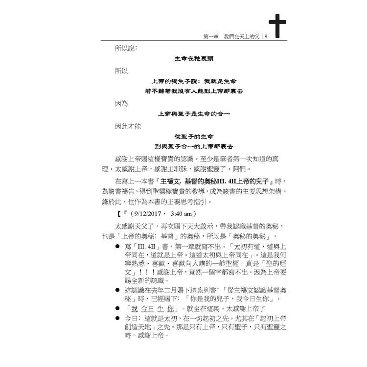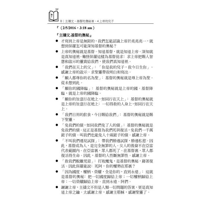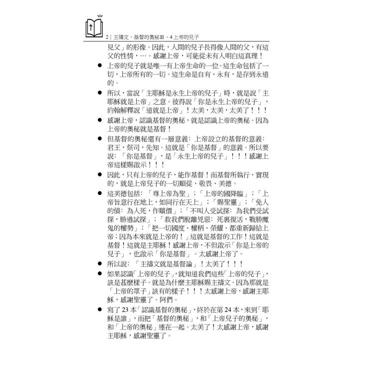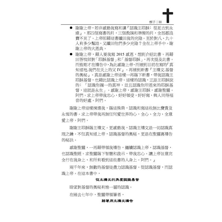  謝謝上帝,藉人要我寫2015感恩,想到介紹此書。再藉回答牧師對「耶穌基督」和「基督耶穌」,再次提及此書。而致剛才在禱告中,為此感謝上帝,而連到目前在寫的『真知道祂.我們在天上的父IV』。再連到新書『主禱文.基督的奧秘』。真是感謝上帝這樣一再賜下新書,帶我認識主耶穌基督,也藉此認識上帝。這樣的認識,正是主耶穌說的﹕「認識你獨一的真神,並且認識你所差來的耶穌基督,這就是永生」。感謝上帝,感謝主耶穌,感謝聖靈。阿們。求上帝帶我忠心,好好領受,好好寫,與人同得福音的好處。阿們。