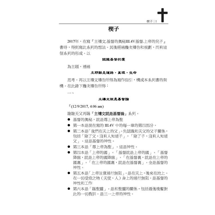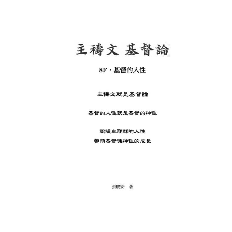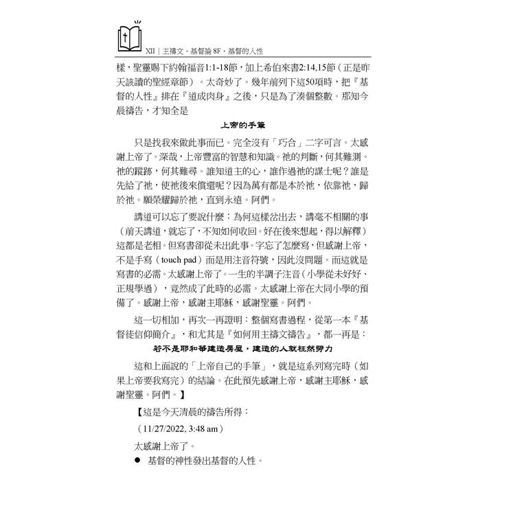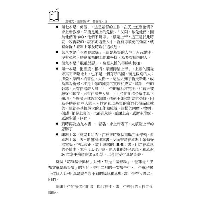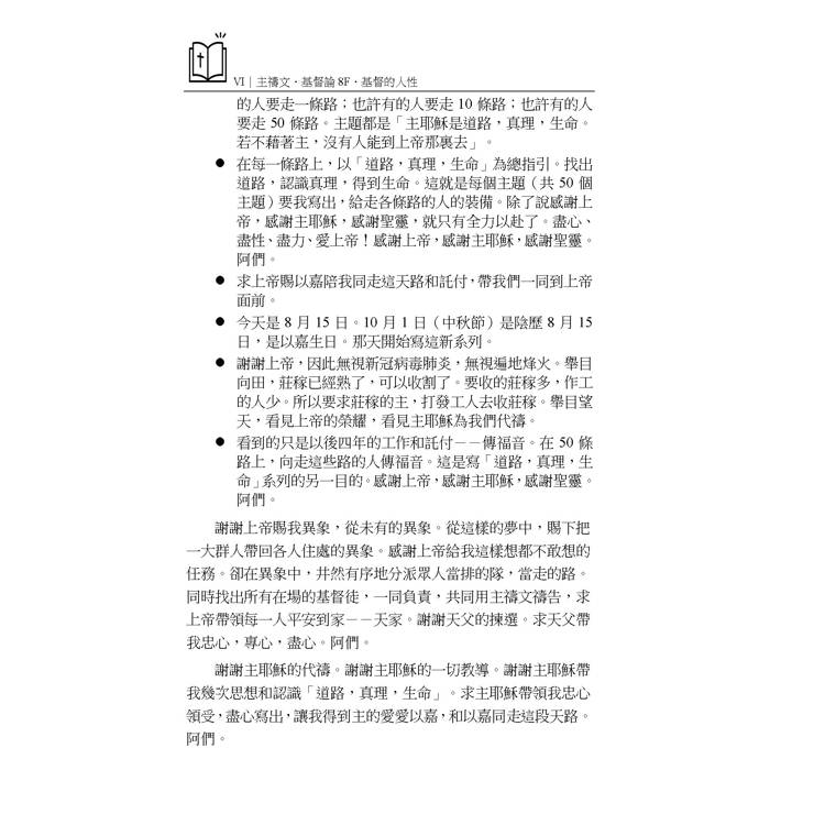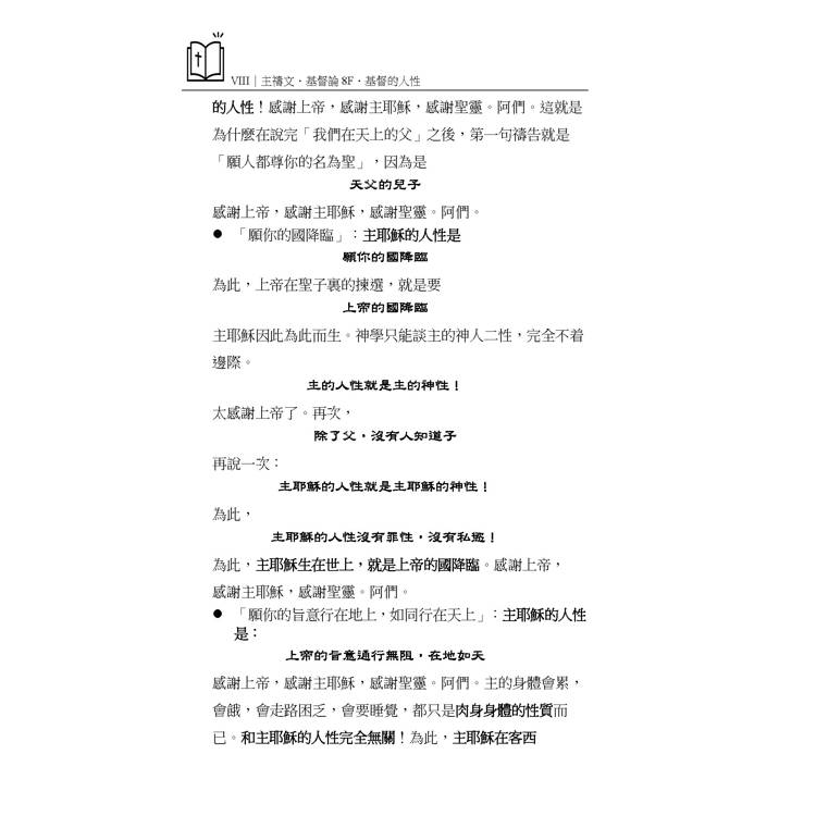 本書,『主禱文.基督論 8F. 基督的人性』,是原來規劃的書『基督的愛.道路真理生命 8基督的人性』的第六本。根據聖經經文,從用主禱文禱告,以禱告所得為寫作指引,認識基督的人性。所選經文與禱告所得列於下: