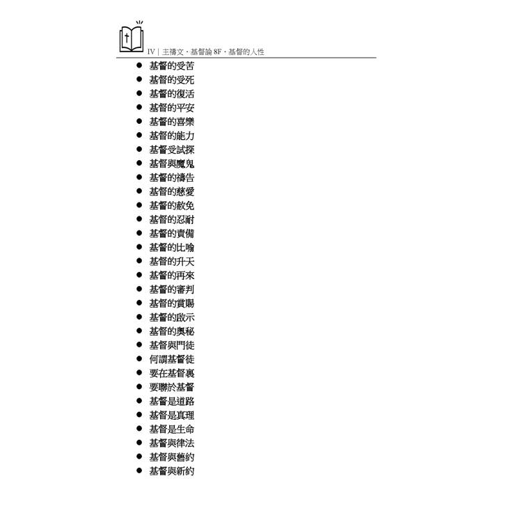 三位一體論;基督的神性;基督與天父;基督與聖靈;基督與聖經;基督的創造;道成肉身論;基督的人性;基督的身份;基督的職分;基督裏揀選;基督裏福氣;基督的美德;基督的性情;基督的救贖;基督的工作;基督的教訓;基督的榜樣;基督的受苦;基督的受死;基督的復活;基督的平安;基督的喜樂;基督的能力;基督受試探;基督與魔鬼;基督的禱告;基督的慈愛;基督的赦免;基督的忍耐;基督的責備;基督的比喻;基督的升天;基督的再來;基督的審判;基督的賞賜;基督的啟示;基督的奧秘;基督與門徒;何謂基督徒;要在基督裏;要聯於基督;基督是道路;基督是真理;基督是生命;基督與律法;基督與舊約;基督與新約;基督與聖餐;基督的榮耀。