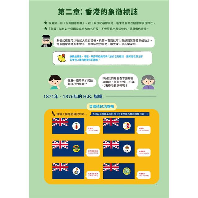 二、殖民地年代的香港,是香港成長不可或缺的元素。美麗新香港的歷史博物館連「殖民地」一詞也要迴避,一般教科書對相關事實亦可免則免,此書卻載有相當資訊,例如群帶路傳說和界碑、殖民地旗幟、香港盾徽及紋章。筆者印象最深刻的是此書花了相當篇幅介紹不同時期的香港旗,讀者藉此能對「香港」建立更真實的感覺。