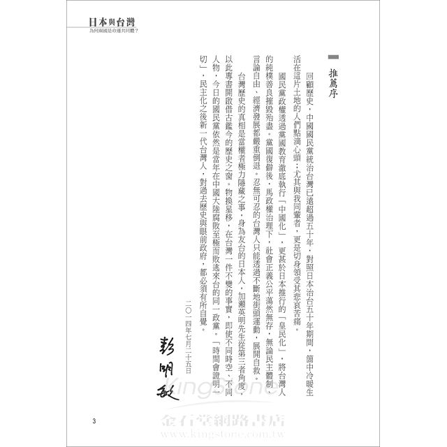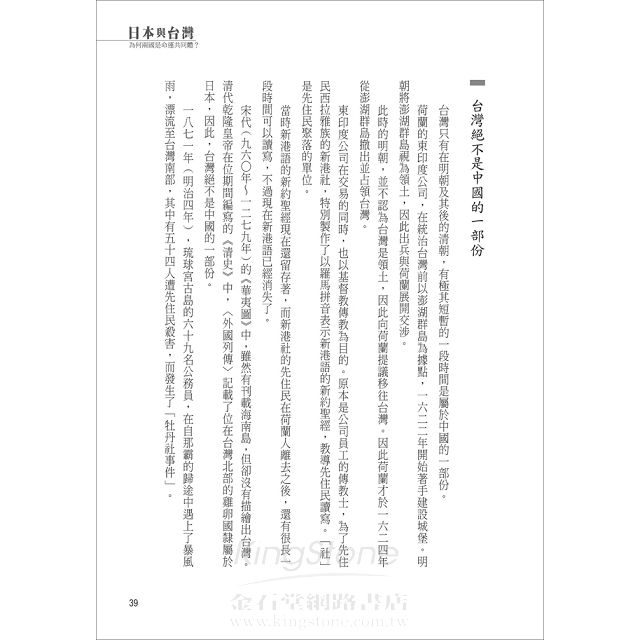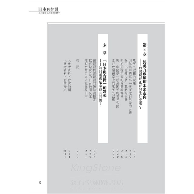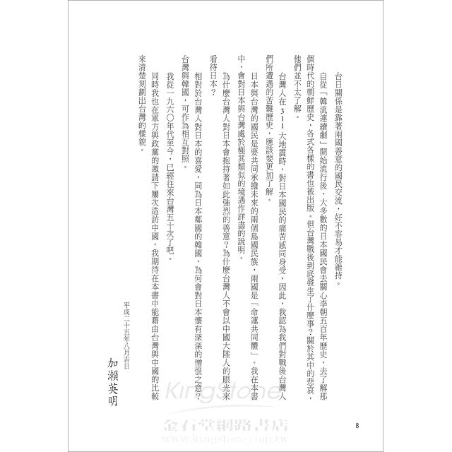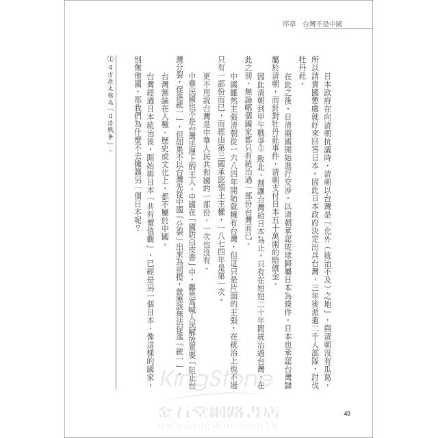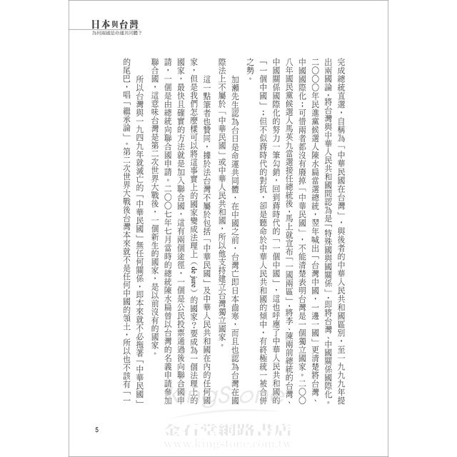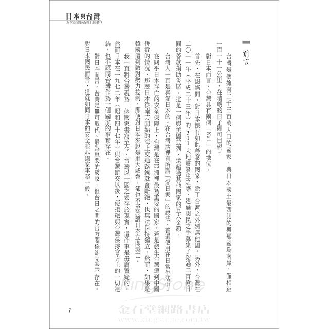 日本與台灣的國民是要共同承擔未來的兩個島國民族,兩國是「命運共同體」。我在本書中,會對日本與台灣處於極其類似的境遇作詳盡的說明。