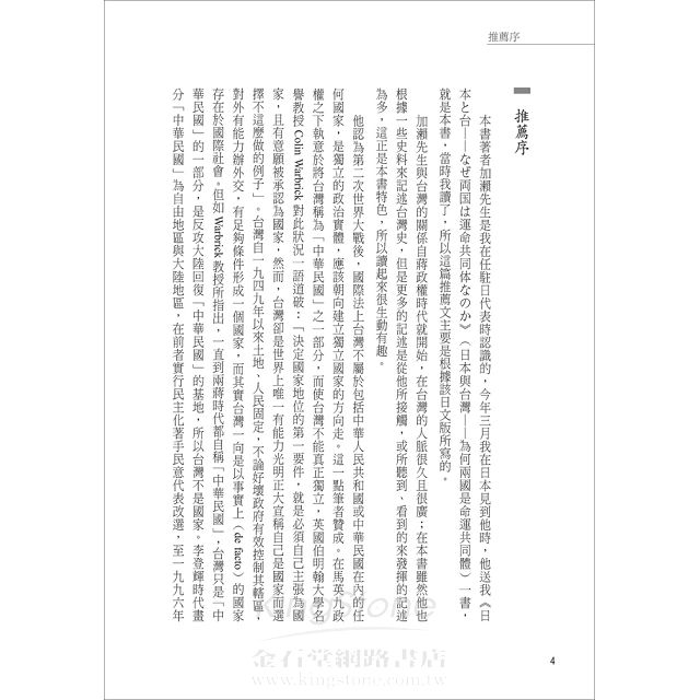 我一直將台灣視為一個國家書寫至今,台灣以一國之姿存於現實,這件事是毋庸置疑的。然而日本在一九七二年(昭和四十七年)與台灣斷交以後,便拒絕與台灣保持官方上的一切連結,也不認同台灣作為一個國家的事實存在。