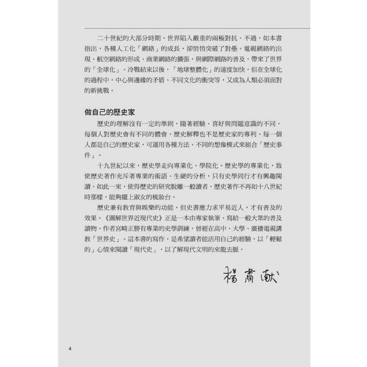 歷史兼有教育與娛樂的功能,但史書應力求平易近人,才有普及的效果。《圖解世界近現代史》正是一本由專家執筆、寫給一般大眾的普及讀物。作者宮崎正勝有專業的史學訓練,曾經在高中、大學、廣播電視講教「世界史」。這本書的寫作,是希望讀者能活用自己的經驗,以「輕鬆的」心情來閱讀「現代史」,以了解現代文明的來龍去脈。