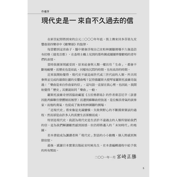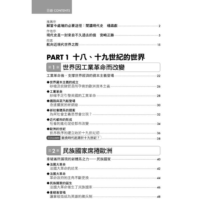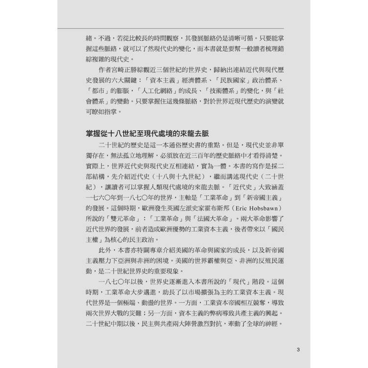 二十世紀的歷史是這一本通俗歷史書的重點。但是,現代史並非單獨存在,無法孤立地理解,必須放在近三百年的歷史脈絡中才看得清楚。實際上,世界近代史與現代史互相連結,實為一體。本書的寫作是採二部結構,先介紹近代史(十八與十九世紀),繼而講述現代史(二十世紀),讓讀者可以掌握人類現代處境的來龍去脈。