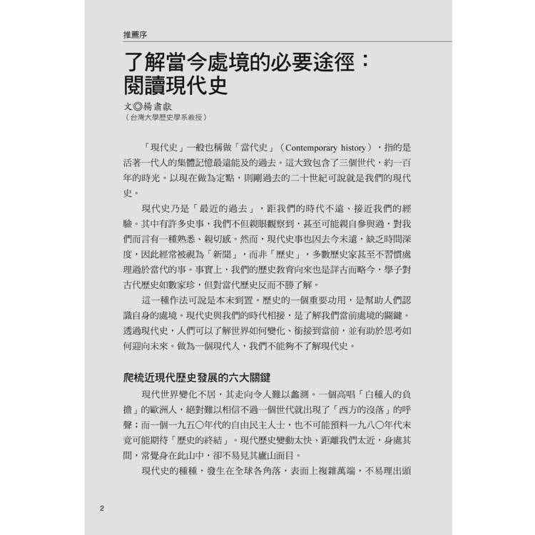 現代史的種種,發生在全球各角落,表面上複雜萬端,不易理出頭緒。不過,若從比較長的時間觀察,其發展脈絡仍是清晰可循。只要能掌握這些脈絡,就可以了然現代史的變化,而本書就是要幫一般讀者梳理錯綜複雜的現代史。