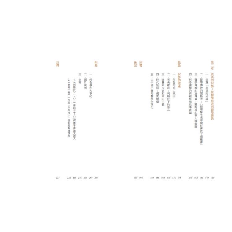 上海復旦大學歷史學系教授高晞以「何魯之死」為題,從這名小人物跨國手術的種種細節,回顧十九世紀初英國試圖透過西醫向中國叩門的時代背景。本書藉由書信、診斷報告、新聞報導、圖像等豐富詳細的史料,從微觀史學的角度,重新梳理這樁近兩百年前引發熱議的大事件,帶領讀者一探彼時西方社會如何看待何魯代表的所謂「亞洲」疾病與人體、第一次鴉片戰爭前,西人在華從事醫療、傳教、商業活動時,意欲藉由哪些方式在中國開拓利益版圖,以及何魯的死亡究竟如何從一場失敗的手術搖身一變,成為西方的醫學慈善事例。同時也將此事引起的震撼,特別是對英國政壇和近代外科醫學史的影響,作出嶄新且深刻的考察。