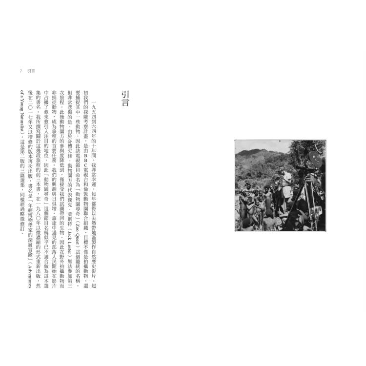 一九五四到六四年的十年間,我非常幸運,每年都得以去熱帶地區製作自然歷史影片,起初我們的探險考察計畫,是由BBC電視台和倫敦動物園聯合組織,目標不僅是拍攝動物,還要捕捉其中一些動物,因此該電視節目命名為《動物園尋奇》(Zoo Quest)這個籠統的名稱。但非常悲傷的是,由於身體欠佳,動物園方的代表傑克・萊斯特(Jack Lester)無法參加第三次旅程,此後動物園方的參與度降低到,僅接受電視節目中我們試圖帶回的生物,因此在野外拍攝動物而非捕捉動物,成為旅程的首要任務。我們的興趣與日俱增,旅途中遇見的部落人民開始在影片中占據了愈來愈引人注目的地位,因此《動物園尋奇》這個節目名稱似乎已不適合做為這本選集的書名。我所撰寫關於這幾段旅程的前三本書,在一九八○年以微濃縮的形式重新出版,然後在二○一七年又以增修的版本再次出版,書名是「年輕博物學家的深層冒險」(Adventures of a Young Naturalist)。這是第二版的三篇選集,同樣經過略微修訂。