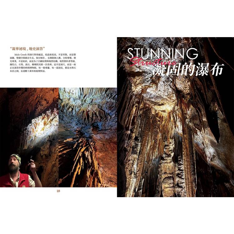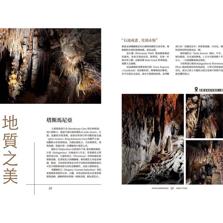 ◎塔斯馬尼亞:莫爾溪喀斯特國家公園(Mole Creek Karst National Park) 位於靠近德文港(Devonport)內陸的莫爾溪小鎮,由州立公園管理。這裡是塔斯馬尼亞最重要、也最精緻的鐘乳石洞穴系統之一,以結晶細緻、形態多樣、燈光導覽專業聞名。數百萬年前的石灰岩地層,長期被地下水溶蝕,形成龐大的喀斯特洞穴。
