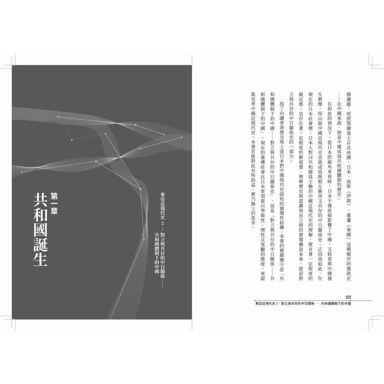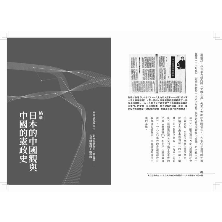 要理解近代中日關係,不能只看外交交鋒與戰爭衝突,更要看中國內部自清末以來「從君主國走向共和國」的巨大轉型。因此,全書以「憲政」貫穿主軸,重新檢視自《欽定憲法大綱》頒布以來,中國在君主國與共和國、仁政與憲政、德治與法治、民主主義與社會主義等論爭中不斷搖擺、反覆試探的百年軌跡。跨越清帝國、中華民國(北洋政府、國民政府)與中華人民共和國,中國的法治主義究竟是如何一步步地發展而來的。與此同時,中國又是如何與亦師亦敵的日本彼此互動。