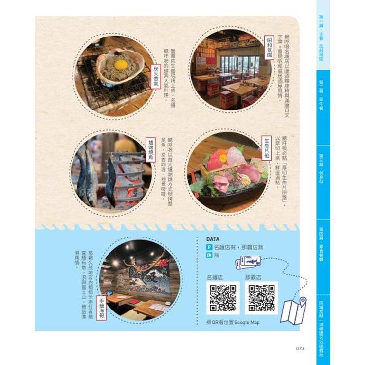 吃──41家在地美食,從海陸空運送到居酒屋的帝王蟹、斑節蝦、生魚片、和牛以及阿古豬,到地方料理的古民家食堂。