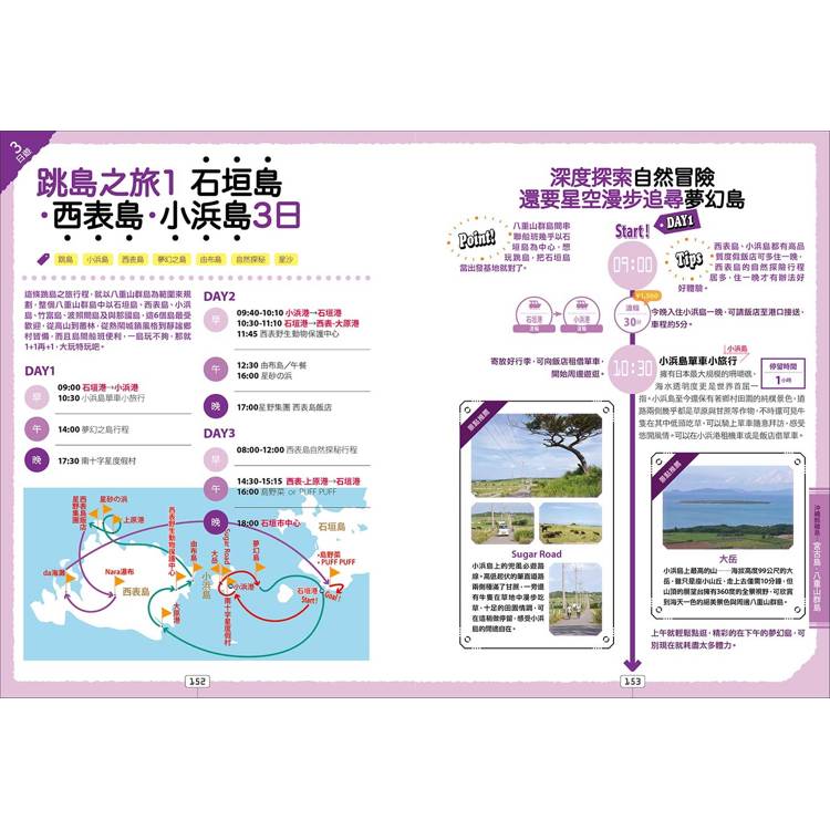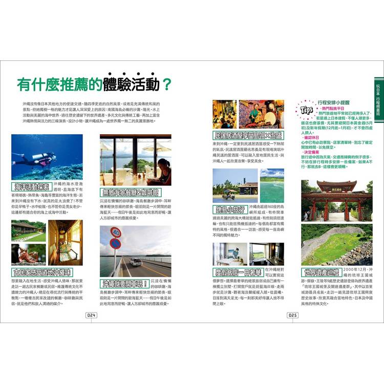 一次K.O複雜交通、票券:從單軌電車到長途巴士、公車,渡輪、快艇等,以及各方PASS、觀光巴士、自駕遊等,龐大資料通通圖表式整理,搭配超詳盡解說和分析,協助你以划算、省時、高CP值的方式暢遊沖繩。