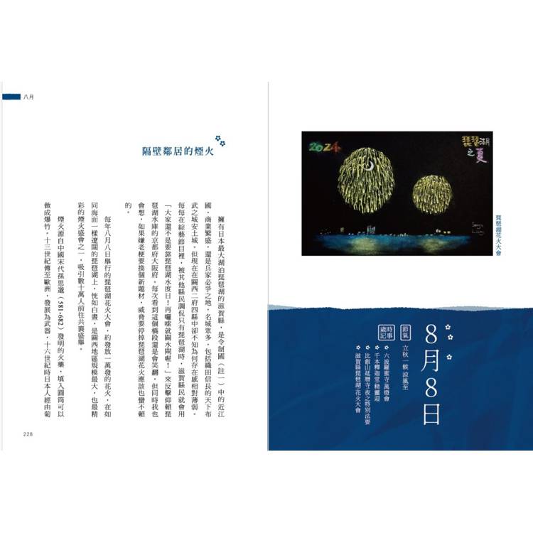 從正月的新年初夢、初詣與白雪覆蓋的神社庭園,到二月的金閣積雪、蠟梅初綻;春日裡百花爭妍、櫻吹雪成川,夏季的薪能、鵜飼與煙火;秋天的滿月與彼岸花,直至冬日銀杏、楓紅與大原雪景──每個時令都有其專屬的風物詩。