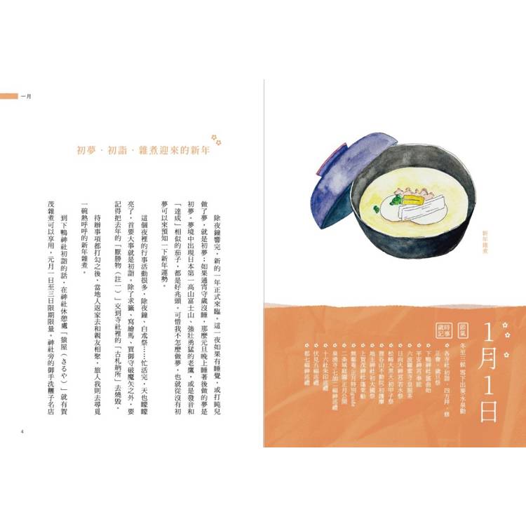 本書以「雪」、「月」、「花」三景,依自然意向貫串全書,展現京都的詩意與美感。作者運用巧思,按月份鋪陳,在十二個月當中,每月挑選出與「雪」、「月」、「花」三景能結合的歲時記事,不僅有景色描繪,還有美食與市井日常,將自然風物與文化底蘊融合,傳達生活在京都的細膩感受,讓讀者有身歷其境的閱讀體驗。