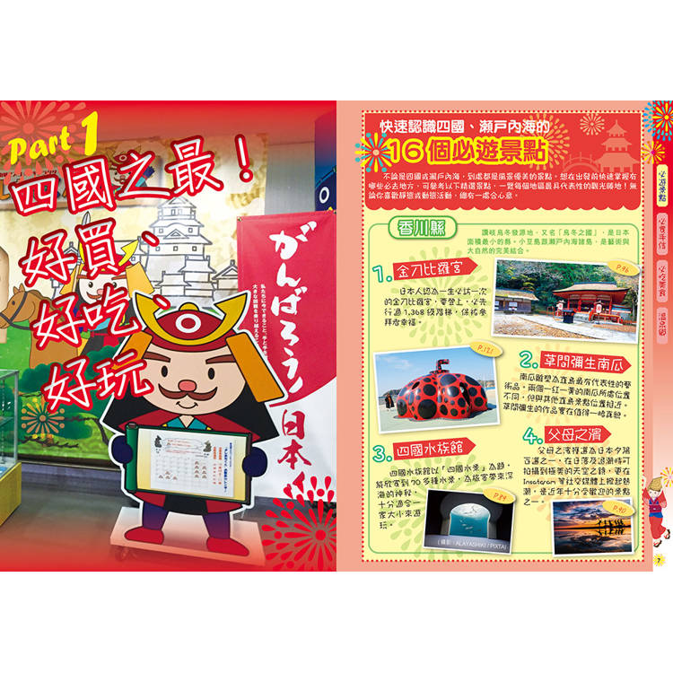 ●必遊景點:四國水族館、父母之濱、鳴門漩渦、小豆島、栗林公園、道後温泉…