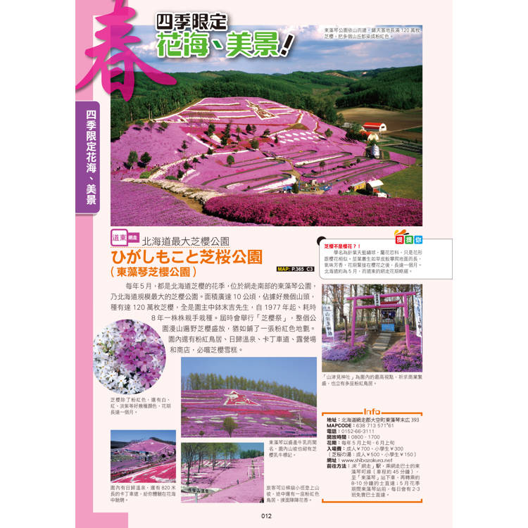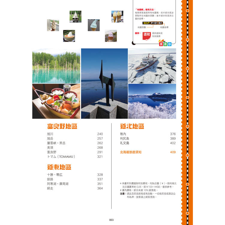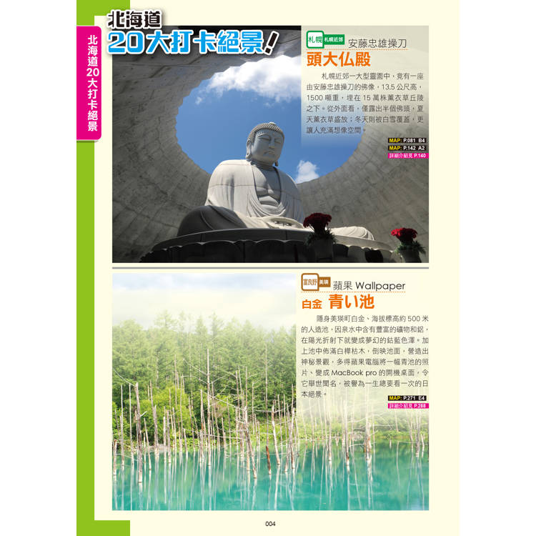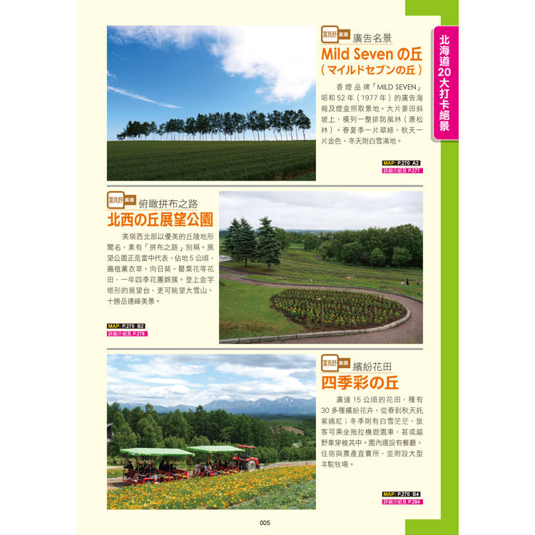 一書416頁,玩盡全北海道以及利尻島、礼文島兩大外島,合共23大分區。特別收錄10大旅遊專題,精選人氣食、玩、買、拍、住景點約700個,資料詳盡冠絕全港!