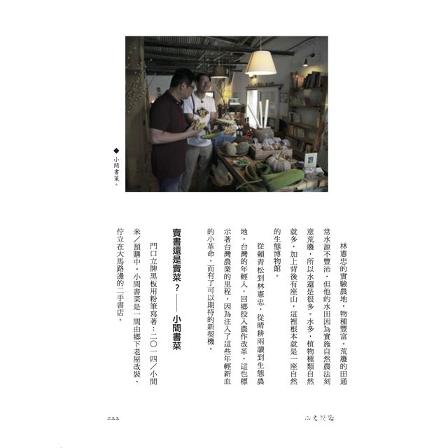 「學習,是讓我對『旅行』保持前進的無限動力。在台灣角落,我們遇見恆春半島的茶農、西螺釀製老蔭油的職人、玉井溽熱芒果樹下的達人、宜蘭水田晴耕雨讀的農人??這些遍及台灣角落的勤奮人們,是我們在旅行之中,拜訪,也是學習的對象。訪談他們對這片土地的堅持,觀察他們這座島 嶼的付出??」──王浩一