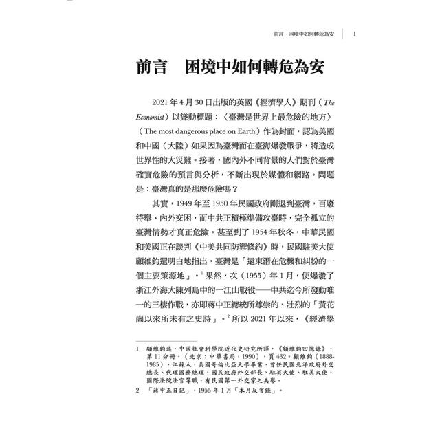 2021年4月30日出版的英國《經濟學人》期刊(The Economist)以聳動標題:〈臺灣是世界上最危險的地方〉(The most dangerous place on Earth)作為封面,意味著當前的臺海情勢暗潮洶湧。然而,1949年至1950年中華民國政府剛退到臺灣,百廢待舉、內外交困,而中共正積極準備攻臺時,完全孤立的臺灣情勢才是真正危險。