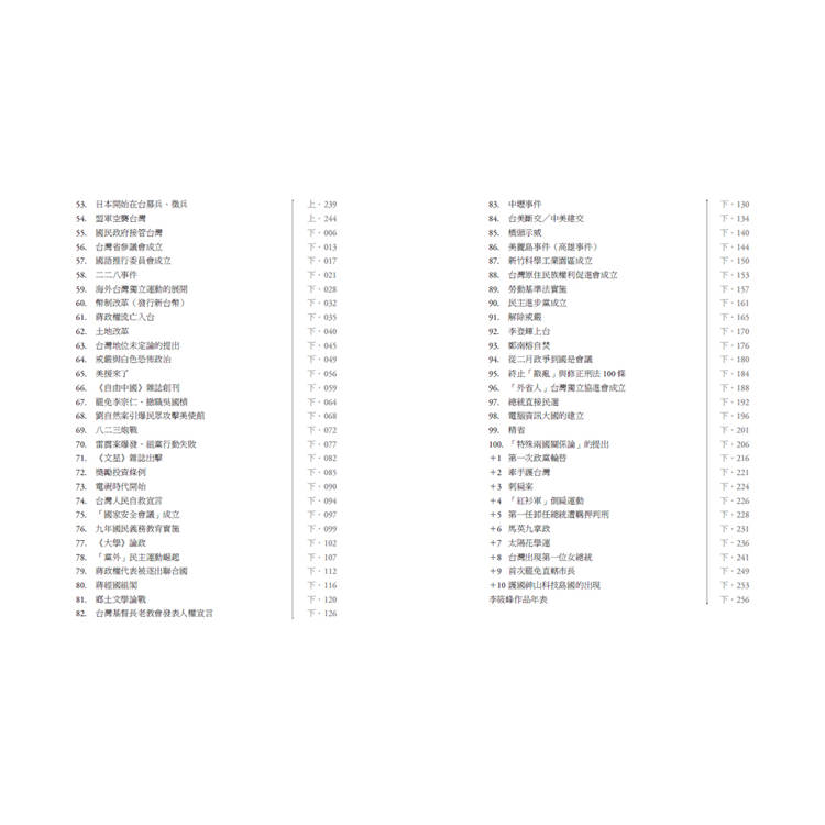 《台灣史100件大事》原本完稿於1999年底,換句話說,本書原本所謂的「台灣史100件大事」是指1999年之前的台灣史上的100件大事。但是,2000年之後(亦即《台灣史100件大事》出版之後),至今已歷24年,這24年之間,台灣又發生了許多重要事情,對往後的台灣必然產生結構性的影響。因此趁本書改版之際,我將2000年後的發展,再增列10個事件。