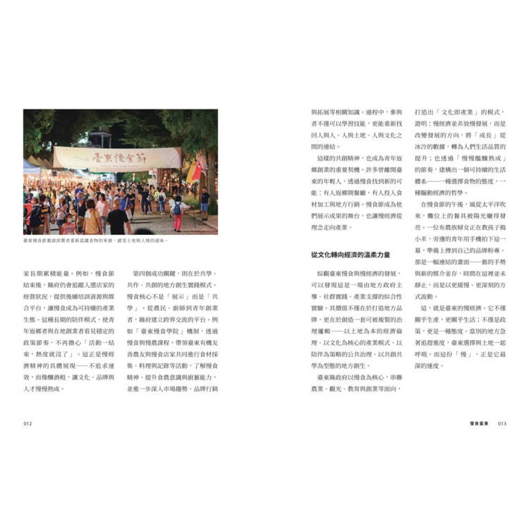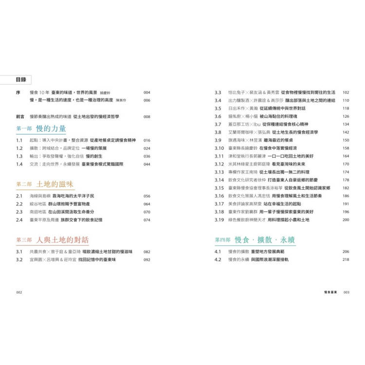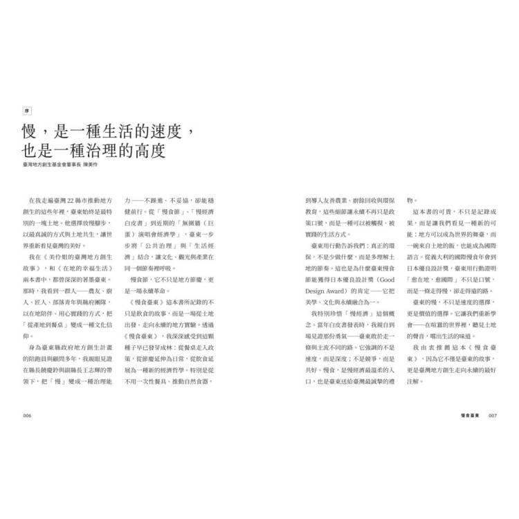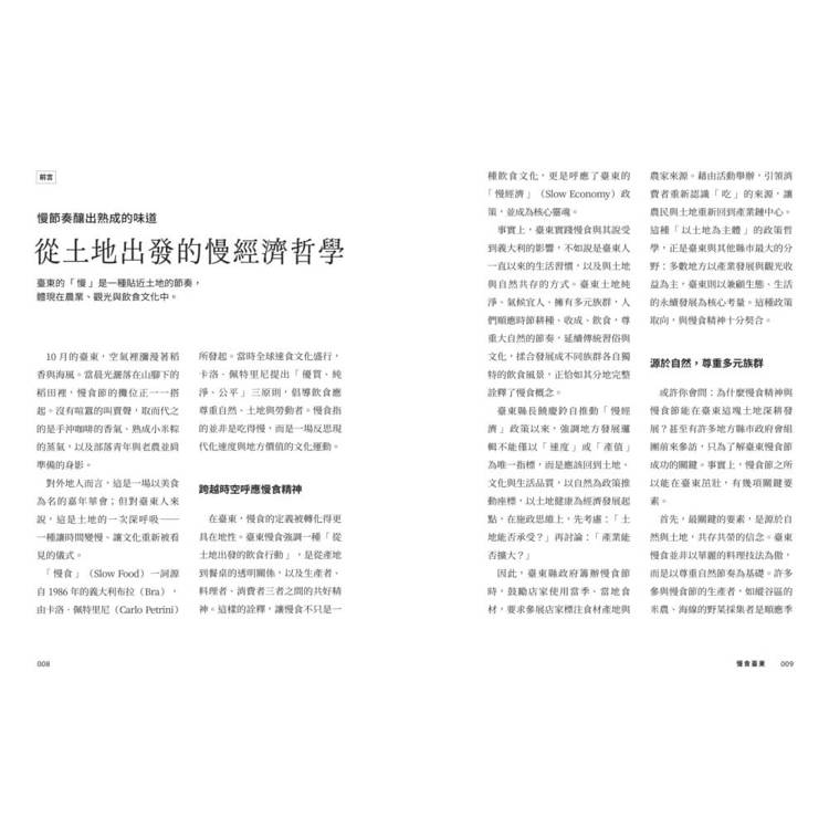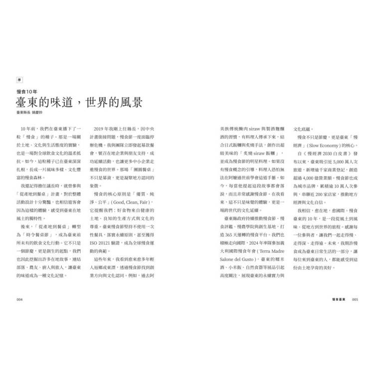 臺東自2015年起倡議慢食精神,藉由每年臺東慢食節落實內涵。臺東慢食強調「從土地出發的飲食行動」,是「從產地到餐桌」的透明關係,以及生產者、料理者、消費者三者之間的共好精神。這樣的詮釋,讓慢食不只是飲食文化,更呼應臺東慢經濟政策,並成為核心靈魂。2025年臺東慢食運動滿10年,透過本書讓外界更理解臺東慢食節發展的歷程與核心概念。