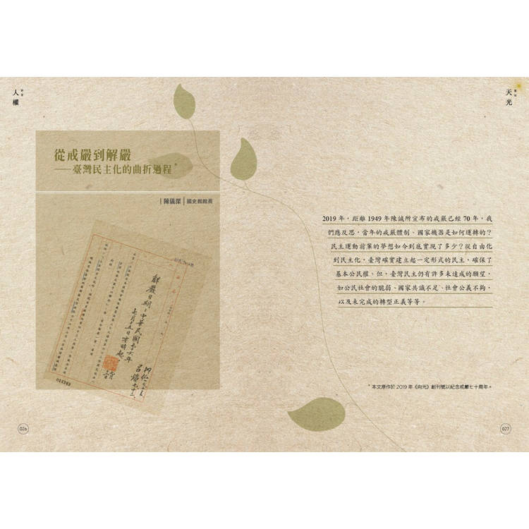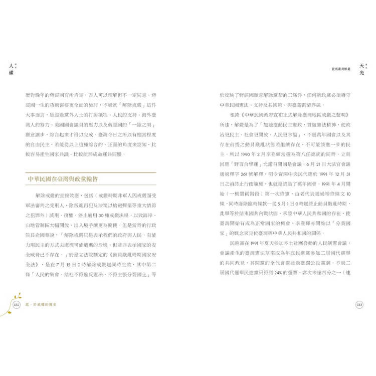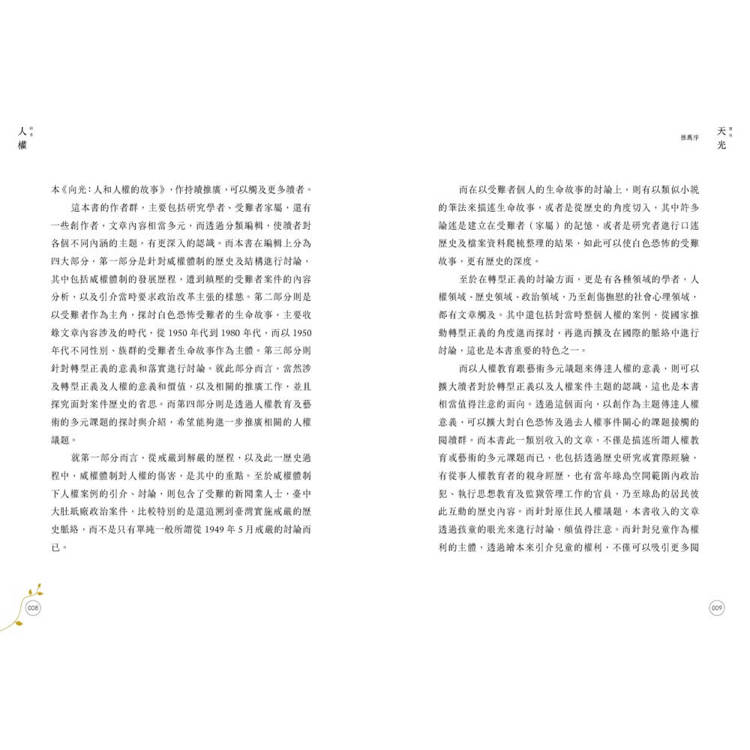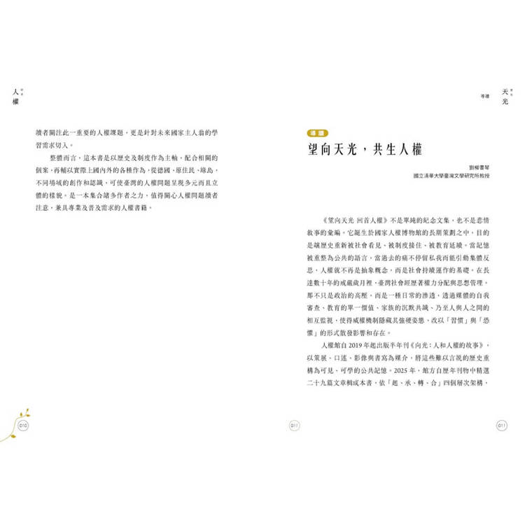 這是一場穿越時空的叩問,邀請國人「卻顧所來徑」,在字裡行間感受那個「無可迴避的時代」。《望向天光 回首人權》回顧歷史,更是對人權普世價值的堅定召喚,提醒我們記取歷史教訓,為臺灣的民主天光點燃不滅的希望之火。
