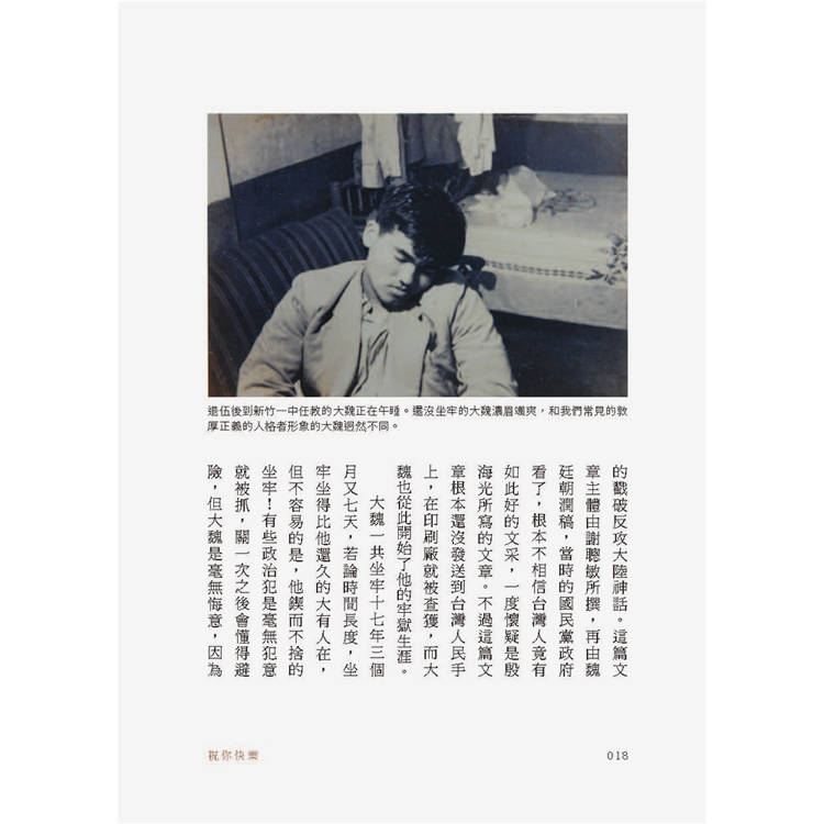 《祝你快樂》一書出版計畫的起心動念,正是立基於此。我們邀請了六位不同領域的專業人士──包括文化工作者、政治工作者、高中教師、台灣史研究者、台灣文學學者,以大魏寫給兒子魏新奇、女兒魏筠的書信為主體素材,透過他們的視角,從「自由主義」、「教育理念」、「家庭觀」、「童趣」、「人生選擇」與「生活觀察」等主題切入,深度詮釋這些家書的當代意義,並重構一個更完整、更立體、更「活生生」的魏廷朝。