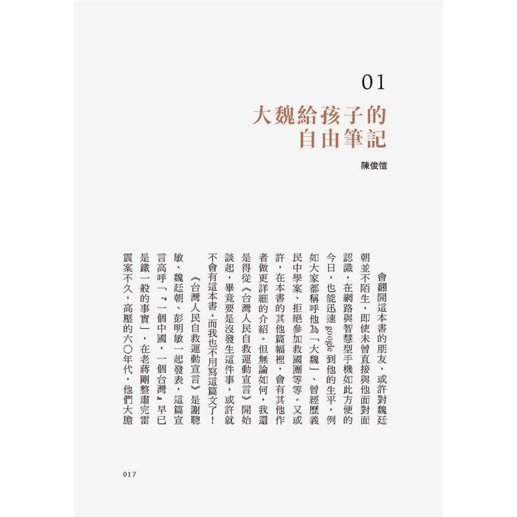 會翻開這本書的朋友,或許對魏廷朝並不陌生,即使未曾直接與他面對面認識,在網路與智慧型手機如此方便的今日,也能迅速估狗到他的生平,例如大家都稱呼他為「大魏」、曾經歷義民中學案、拒絕參加救國團等等。又或許,在本書的其他篇幅裡,會有其他作者做更詳細的介紹,無論如何,我還是得從《台灣人民自救運動宣言》開始談起,畢竟要是沒發生這件事,或許就不會有這本書,而我也不用寫這篇文了!