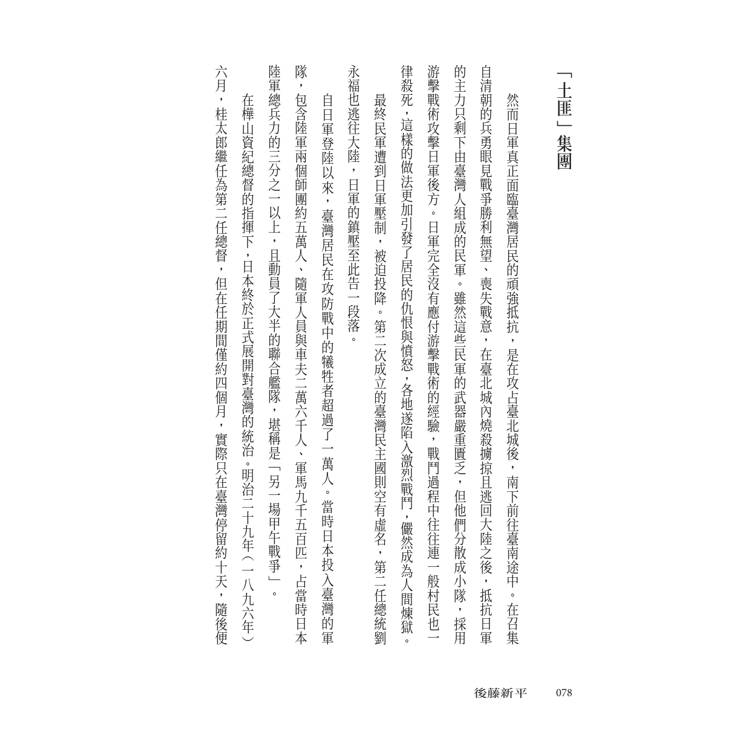 二、日本領臺初期對於「土匪」(抗日武裝集團)問題,以「三段警備」制度應對,但成效不彰(參見本書第二章)。後藤新平抵臺後,恢復清代的「保甲」制度,兼採「招降」、「鎮壓」並行策略,逐步掃除臺灣的「土匪」勢力(參見本書第三章)。
