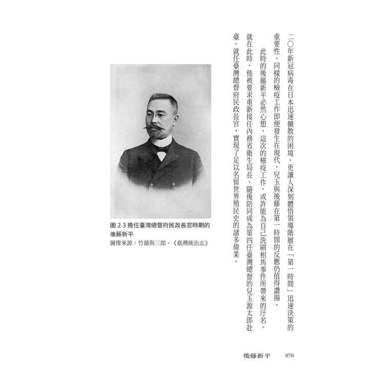 後藤新平,是讀臺灣史,特別是日治時期臺灣史,無法繞過的名字。他在1898年來到臺灣,在兒玉源太郎總督任內擔任總督府民政長官,直到1906年離開。在這八年半任期內,後藤新平在臺灣建立了現代政府的治理形式,奠定臺灣資本主義化的基礎工程,讓臺灣走上現代化的道路。但本書的內容不僅止於介紹一位殖民地官僚的政績,而是透過後藤新平的視角來看待這段時期的歷史,並指出當時臺灣的命運是如何與日本史、東亞史,乃至於世界史緊密相連。