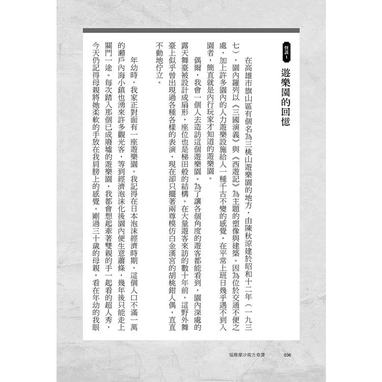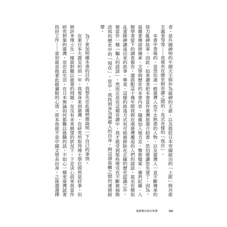 作者逐一聚焦這些幾近鮮為人知的南臺灣歷史、傳說、人物、文化與民俗,並在故事發生的過去與當下之間來回穿梭,以天馬行空的自由筆觸書寫。讀者在不知不覺間被這些故事深深吸引,最終甚至分辨不出自己讀的,究竟是歷史書、小說,還是旅行紀錄。更準確地說,正是這種彼此交錯的混合型文體,構成了本書的獨特魅力。