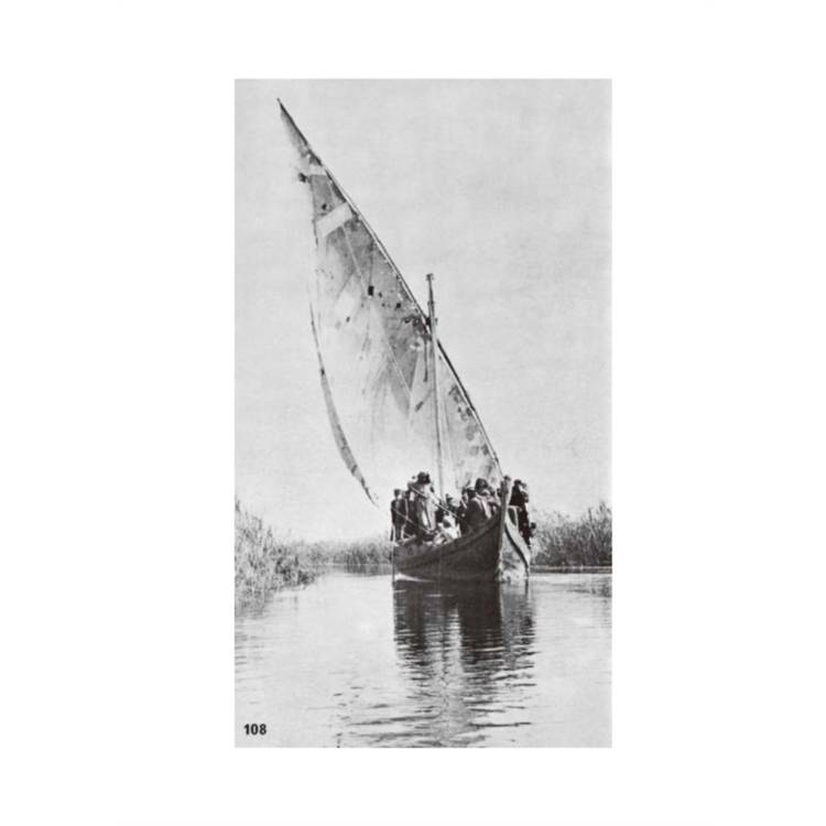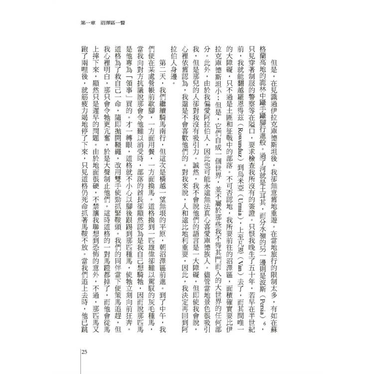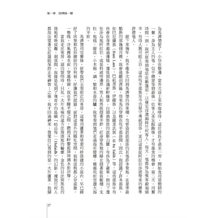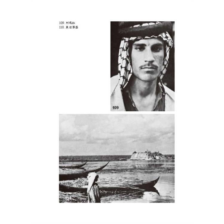 六個月後,我乘著一艘塗過瀝青的漏水伐舟,由兩名阿拉伯舟夫操槳,沿著底格里斯河的一條支流航向沼澤區。兩名舟夫中,一位是骨瘦如柴的老人,身穿打有補釘、顏色難辨的長衫;另一位則是年僅十五歲、患有斜視的粗壯男孩,他在嶄新的白衫外,罩了件破爛的歐式外套,為了防止白衫拖到地上,還特地繫了條皮帶,把白衫束起拉高。他倆都戴著南伊拉克回教什葉派(Shiites)族人常用的頭巾,這長寬各三呎的白色方巾上,有黑色網狀的花紋。由於他們沒有繩狀頭箍圈,只好把方巾折成三角形,扭成一股後纏繞在頭上。那老人坐在翹起的舟尾,我坐在他腳下,雙腿盤坐在舟底的草蓆上,面對著行李。行李包括兩只黑錫箱,其中一只裝滿了藥品,另一只則裝有書籍、底片、彈匣,以及一些零碎的雜物。鋪在兩只箱子上的,是編織得五顏六色的庫德式鞍囊,裡頭塞了毯子以及換洗衣物。斜靠在鞍囊旁的,則是我的獵槍,還有用帆布套裹著的A點二七五瑞格比來福槍(Rigby rifle)。