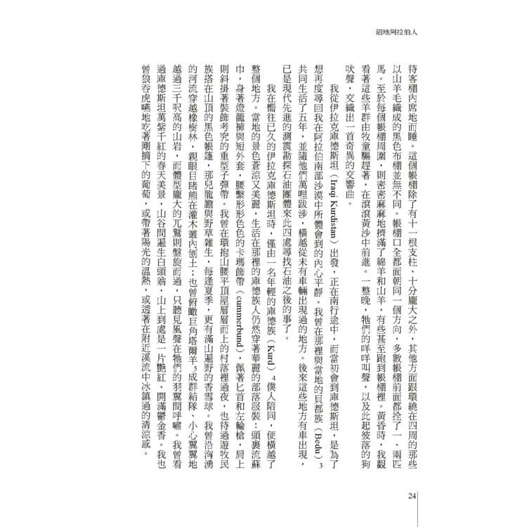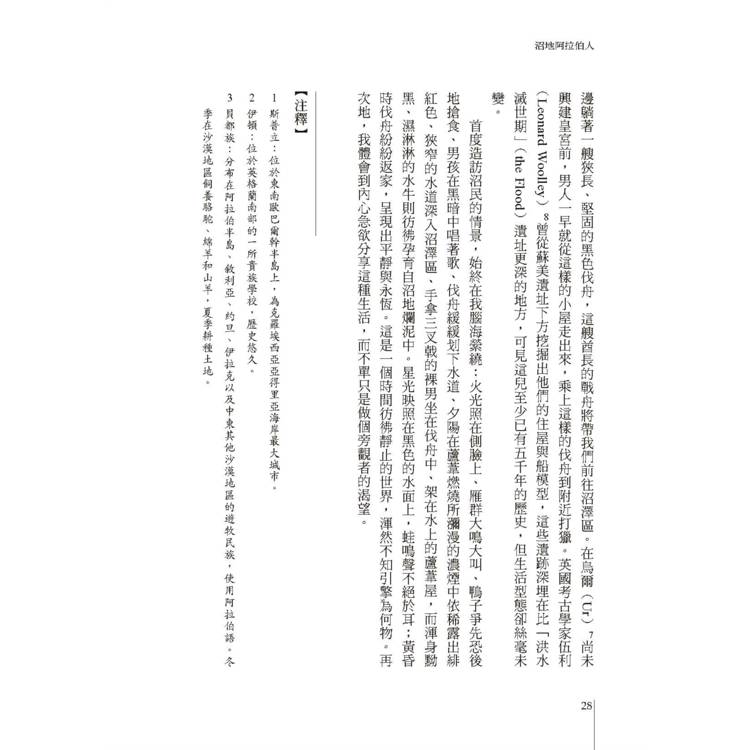 他與沼民共同生活,用矛叉魚、吃沾了灰塵的麵包、喝水牛奶,也加入他們的打獵行列。這些阿拉伯部族所居住的,是迥然不同的「沙漠」,他們身處一片水世界中,以大蘆葦搭建浮島和錯綜複雜的水上建築,並在還不會走路前,便學會了划獨木舟。