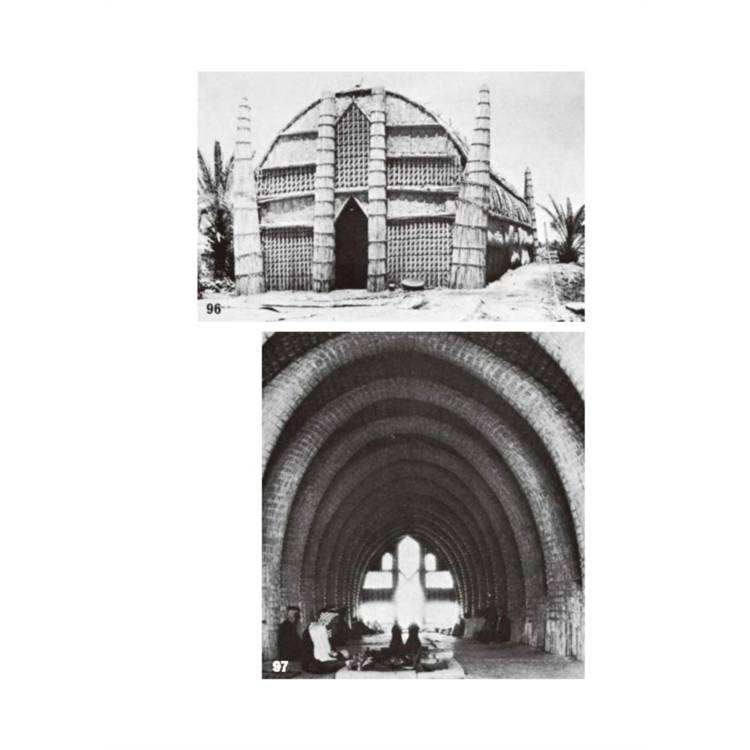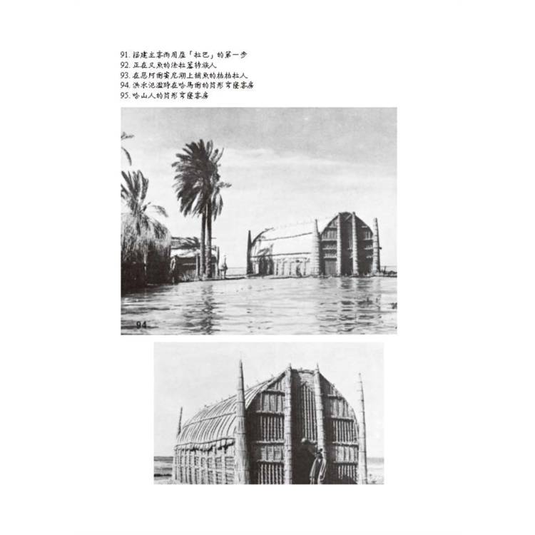 然而,又轉過彎時,河面出現了支流,只見一排建築精良的蘆葦大宅面對著主流,後頭的空地上則矗立著一棟平頂磚造平房,宛如碉堡。不過,令我印象最深刻的,卻是一棟以蜜色草蓆為頂的筒形穹窿建築,這屋子的前後兩端都有四根錐形柱,打破了匡頂的線條,建築坐落在主、支流間的岬角上。老舟夫說:「那是法里酋長的『穆德希夫』(mudhif,意為客房)。」只見站在門口的少年進屋去後不久,幾個男人便走了出來,等著我們的船靠岸。「法里酋長。」老舟夫說道,指著一位體格粗壯的男子,他穿著深色厚罩衫,外披精緻的棕色斗篷。