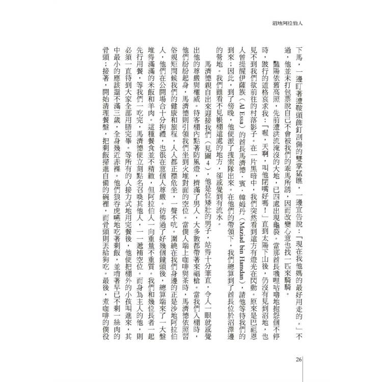 大廳裡瀰漫著嗆鼻的濃煙,由於眼睛習慣了外頭燦爛的陽光,屋內的光線顯得特別昏暗。只見幾個陰暗的身影靠牆站著,我大聲地用阿拉伯語說:「祝您們平安!」這時他們才異口同聲地回答:「也祝您平安。」我們在幾塊下墊草蓆的俗麗小地毯上坐下來,其他人也跟著靠牆安坐。那些攜帶來福槍的人,都把槍放在自己面前。我注意到在房間遠遠的另一頭,舖了兩塊很漂亮的金藍相間舊地毯,顯然是因為我們所坐的現代化地毯受寵,它們才被降級擺在遠離貴賓席的地方。至於牆的另一頭則放著一只木箱,而靠近入口的地方,有個由木架托住的大陶壺,裡面裝滿了水。除此之外,就沒別的家具了。爐床位於進房後三分之一距離處的正中央,升著小火的火堆旁排著十二把咖啡壺,其中最大的約達兩呎高。依照阿拉伯習俗,大壺裡煮的是其他壼倒進去的咖啡渣,而壺內已變淡的咖啡,就再分別倒入其他壺中。至於最小的咖啡壺內,則永遠煮著新鮮咖啡,以隨時準備招待貴客。有位身穿白衫的老人,也是屋內唯一跟我一樣未披斗篷的人,忙著奉行這項由來已久的習俗。等咖啡豆烘焙好後,他便如往常般,將它們放入小銅臼,搗出陣陣美妙的節奏。只要這悅耳的聲音一出現,便意味著酋長客房要上咖啡了,而任何風聞其聲的人都是受邀的對象。隨後,那老人左手拿著咖啡壺,右手持著兩個比蛋杯稍大的瓷杯,接著倒了點咖啡在手上最上頭的杯內,請法里品嘗,但酋長卻要他先奉咖啡給我。我雖婉拒,法里卻一再堅持;不過,我還是等到老人將第二杯咖啡倒好呈給他後,才開始喝。那咖啡嘗起來既濃又苦,但由於深知阿拉伯人的習俗,我連喝了三杯,之後,才輕搖空杯,表示已喝夠了。接著咖啡伙夫按賓客身分的高低,緩緩繞行屋內,一一為他們奉上咖啡。此外,又為法里、我,以及載我到此的兩位舟夫送上了茶,而這很濃的甜紅茶則盛在鑲金邊的細腰小玻璃杯內。這時法里年方十六的長子走了進來,他雖有著跟父親一樣的大鼻子,臉型卻比較窄,也比較陰柔。法里為我倆引見時,稱呼他為「您的僕人」。接著法里便要他去瞧瞧午餐準備得如何,還一面對我說:「慚愧得很,沒法招待您吃頓像樣的飯,您要是能事先通知一聲就好了。請務必海涵,但是我想,您長途舟車勞頓,一定餓了,想必寧願吃頓現成的便飯,也不願等我們宰頭羊吧!」