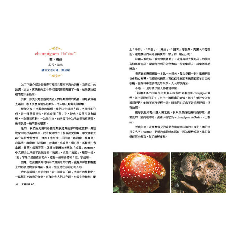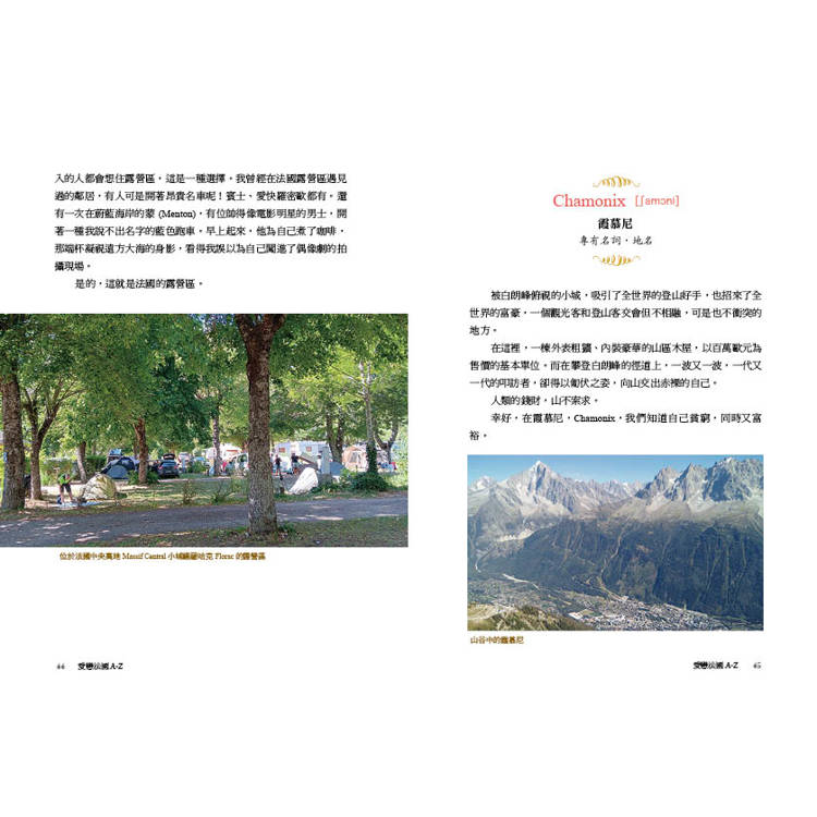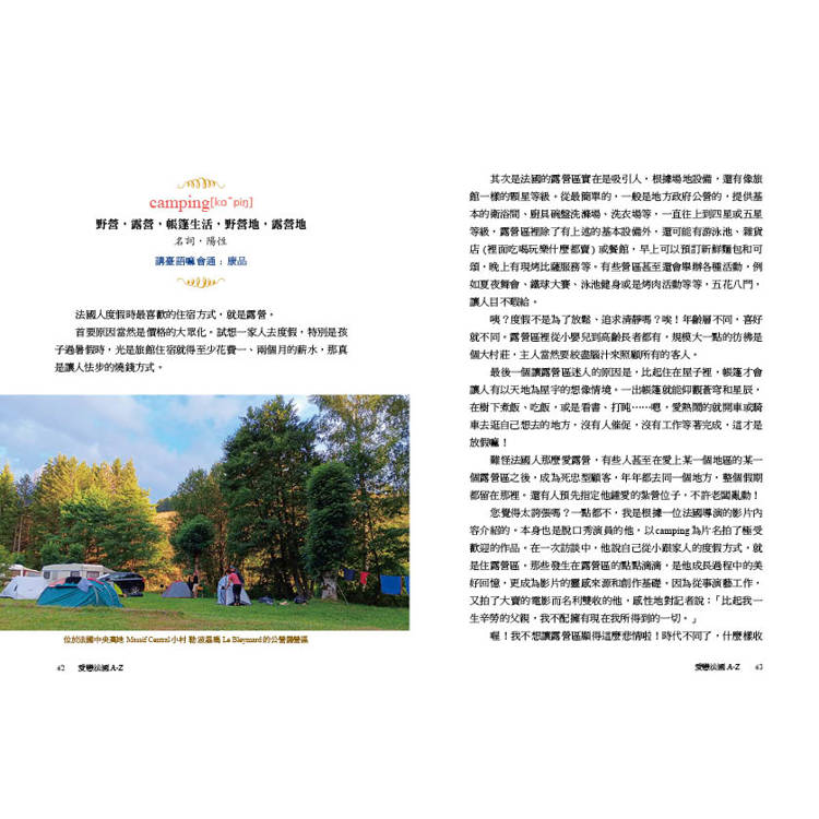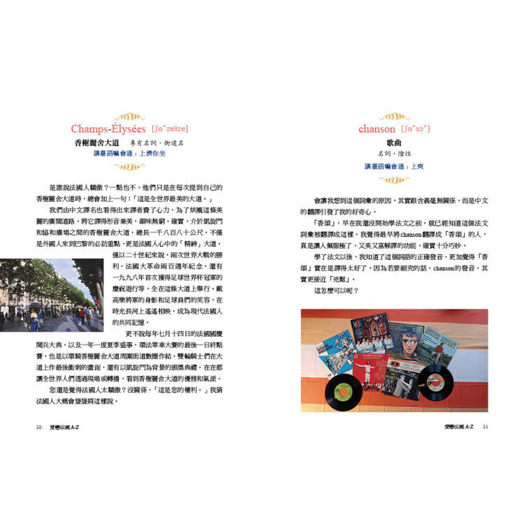 當您翻開《愛戀法國A-Z》時,您不僅能透過法語來認識法國和法國人,同時也宛如在文字的森林中探險。我們在林中尋找途徑,有時可能會踉蹌不穩,但是一直勇往直前,而這過程讓我們不斷地學習。學法文的臺灣人常常覺得這語言溫柔又悅耳,可是文法艱難而且發音不好學。在《愛戀法國A-Z》中,法文詞彙不再是讓人唸不出名字的敵人了,它們變成了朋友,就如《小王子》中的狐狸一樣,在被馴養之後,會和我們分享它們的日常生活點滴,說出它們的故事,還有,傾吐它們的秘密。