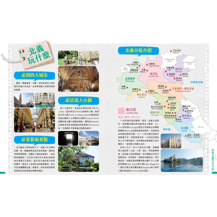 義大利北部八大區域中,初訪米蘭、威尼斯、佛羅倫斯、羅馬等義大利的經典城市,並精選極具義大利獨特風格的16座風情小鎮和3個當地度假湖區,詳細介紹該城鎮遊玩景點,透過名畫解說、建築細節、名人歷史故事,傳達義大利深厚的文化底蘊。搭配所附的交通指引、建議行程規畫、推薦食宿,吃喝玩樂一次包辦。