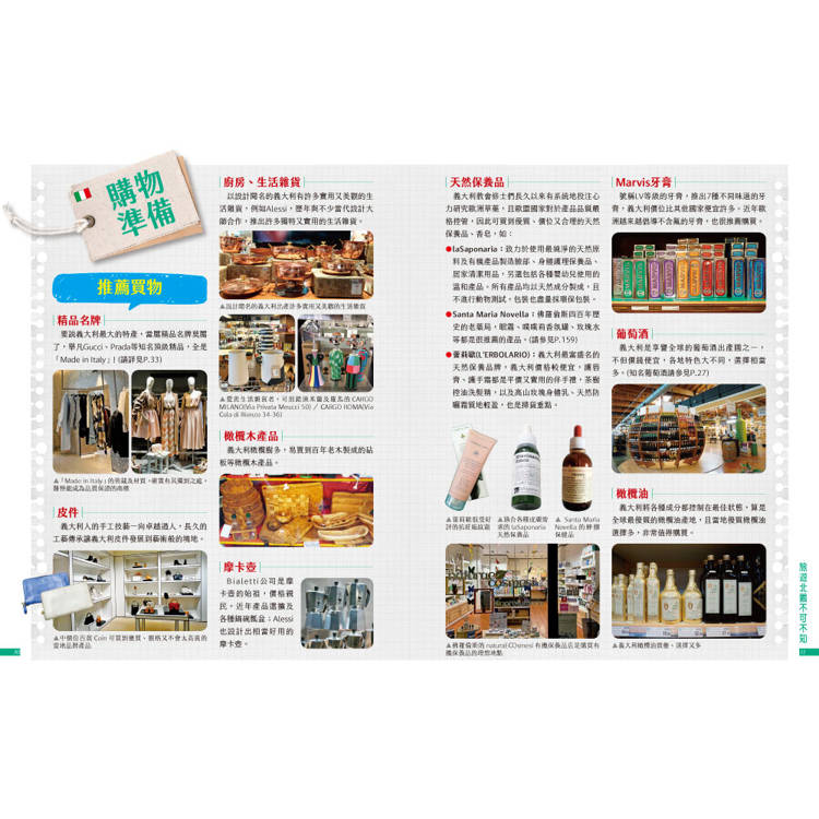鎖定米蘭、佛羅倫斯購物街區將義大利精品名牌Gucci、Prada、義大利始祖開發的摩卡壺、有機葡萄酒醋、優質天然的保養品蕾莉歐(L'ERBOLARIO)、號稱LV等級的Marvis牙膏等,以及獨立小店服飾、特色皮革製品等一次掃齊。