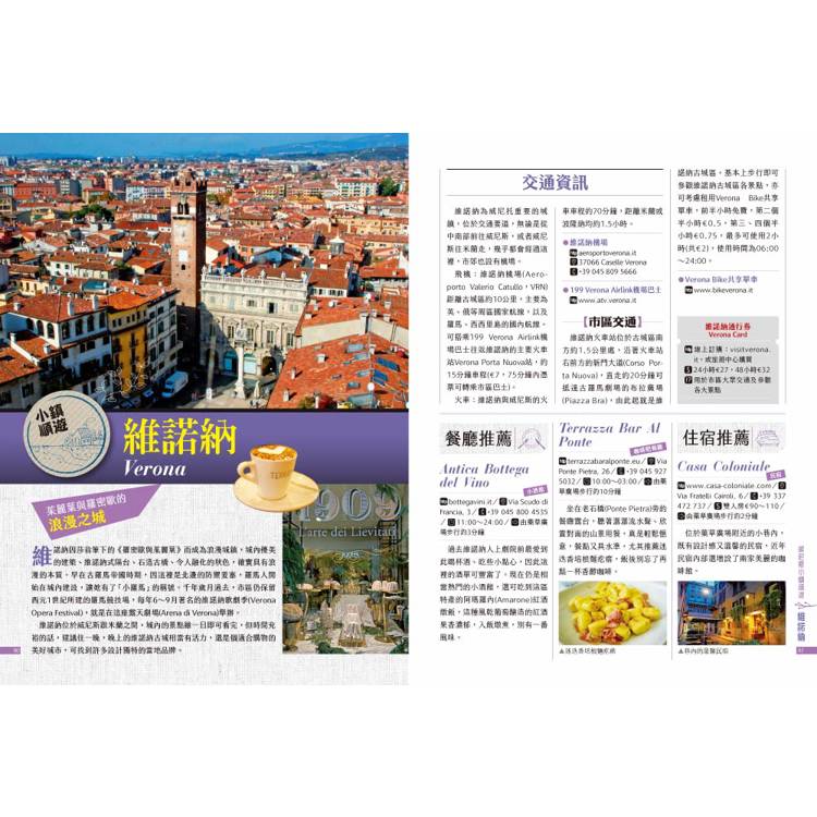 熟能而詳的羅馬、米蘭、威尼斯、佛羅倫斯,讓我們換個旅程步調遊玩,如與米蘭人一起去當地熱門避暑勝地貝拉焦、瓦倫納湖邊小鎮度假、或避開旅客如織的威尼斯人潮恣意散步、遊走於羅馬人喜愛聚集的越台伯河區、或在繁華的佛羅倫斯內來趟菲耶索萊尋根之旅。