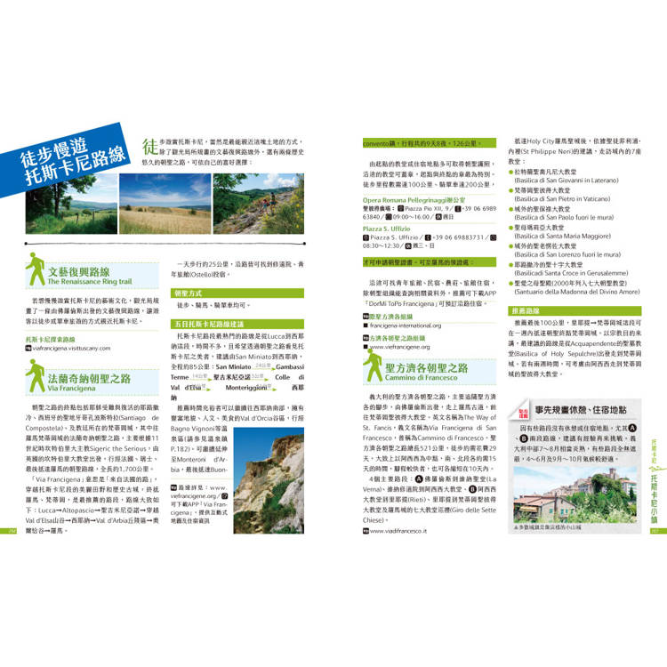 到訪區內著名的佛羅倫斯外,用另一個角度徒步探尋托斯卡納與周邊地區吧!安排了3條徒步路線,有2條為朝聖路線,其中還有能取得朝聖證書,本書提供時間規畫和領取證書的相關資訊,來趟心靈沉澱的朝聖旅行;想要品味更具義大利中古世紀風情可暢遊周邊聖吉米尼亞諾、西耶納、蒙特普齊亞諾等小鎮。