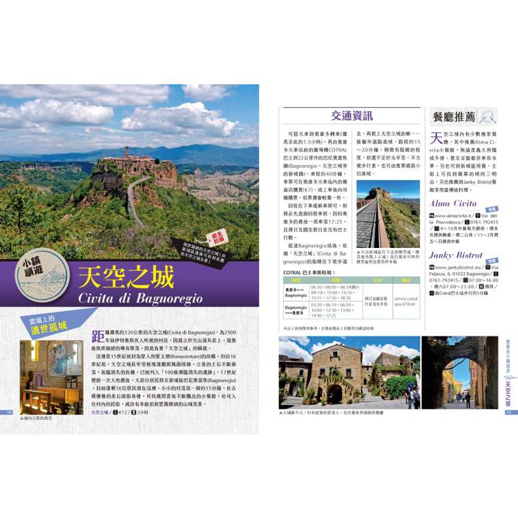 這座在懸崖邊的古城鎮,其地底世界堪稱地上景致豐富,來參觀由老祖先伊特魯斯坎人建築的大聚落,探索古老遺留的生活遺跡外,再搭乘巴士前往郊區絕世而獨立的天空之城,壯觀而震懾景致感受人類的渺小,快來這座在消逝中的珍貴人類資產吧!
