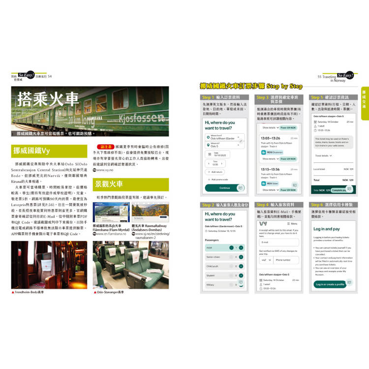 挪威地形複雜及氣候多變,多倚靠飛機、火車等交通工具串聯,飛機及火車訂票步驟圖解,以及行程規畫時須注意事項。