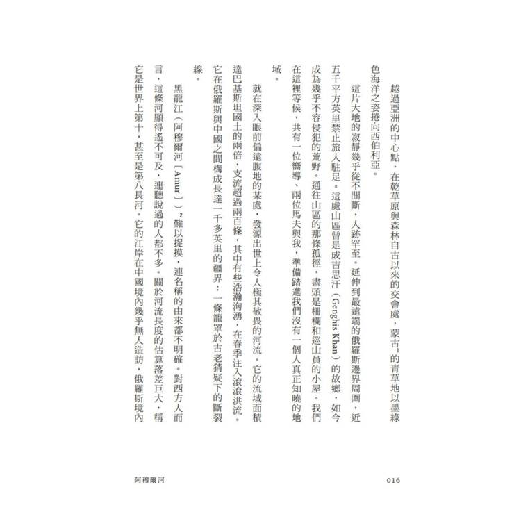 他重拾俄語和中文,與沿路遇見的人交談,從中國商人到俄國漁夫,佛教僧侶到河畔原住民。最終他抵達大河的孤寂盡頭,十九世紀俄羅斯的帝國夢至此漸漸淡出,關鍵世局豁然開朗。